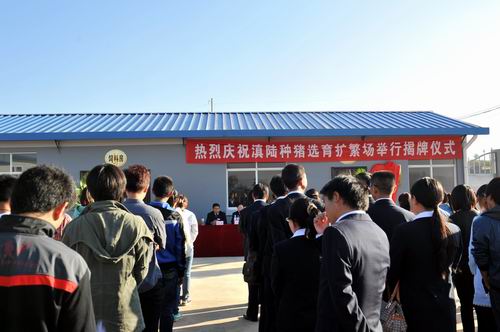 金日扬帆,猪事顺利!2012年10月26日清晨8点30分,迎着朝阳,满怀欢喜,满怀希望,畜牧兽医系在新落成的滇陆种猪扩繁场大门外举行了一个简短但却意义非凡的仪式——滇陆种猪选育扩繁场揭牌仪式。仪式由系主任赵跃主持。