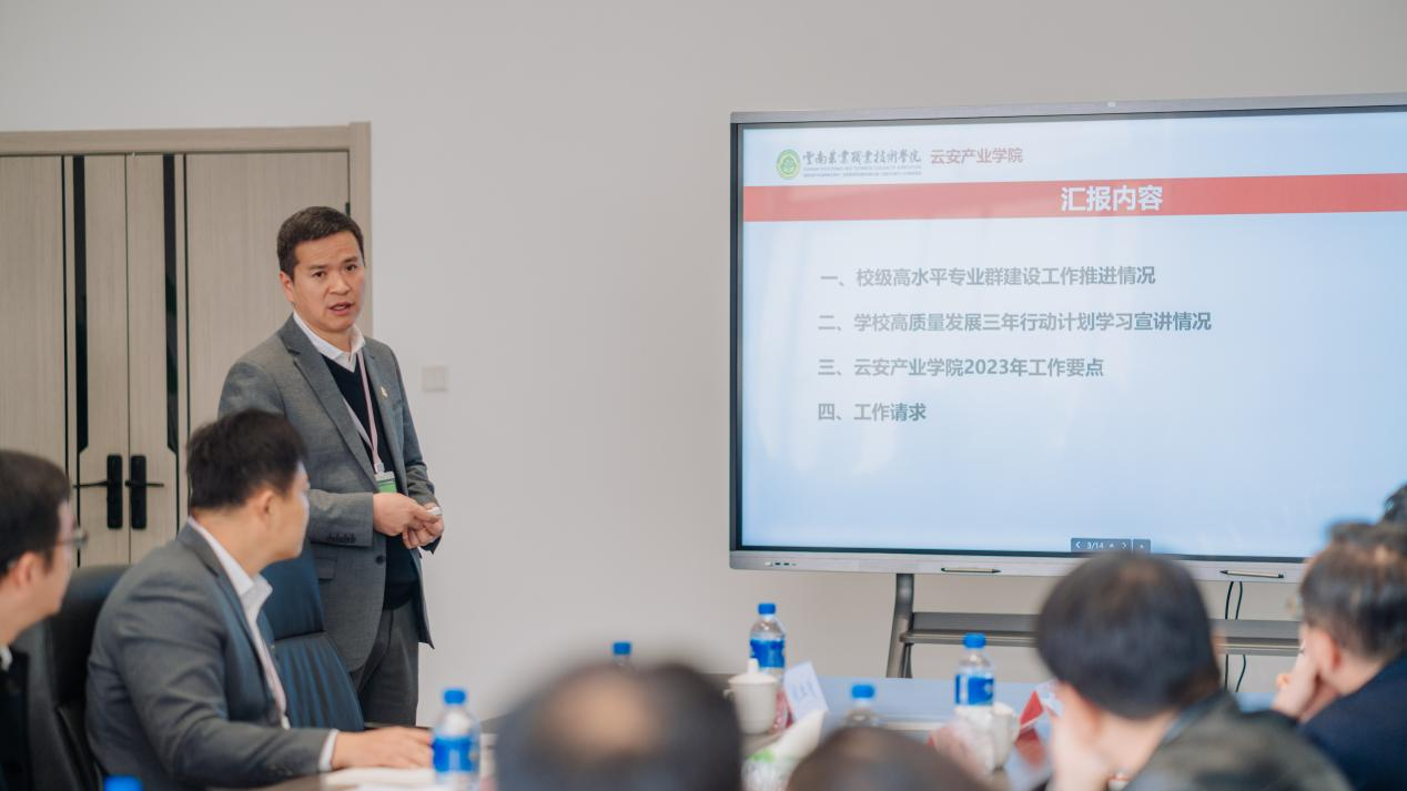 会上,云安产业学院党总支书记李一源就学院党总支基本情况及党建工作成效等方面首先进行了汇报,随后,院长徐红卫从云安产业学院校级高水平专业群建设工作推进情况、学校高质量发展三年行动计划学习落实情况及2023年工作要点等方面进行了详细汇报,与会人员针对汇报内容进行了交流发言。