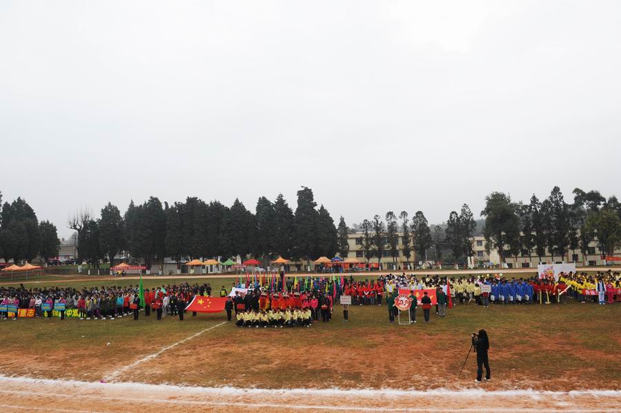 运动员入场后,升旗仪式开始,在雄壮嘹亮的国歌声中,全体师生庄严肃立,向国旗行礼。