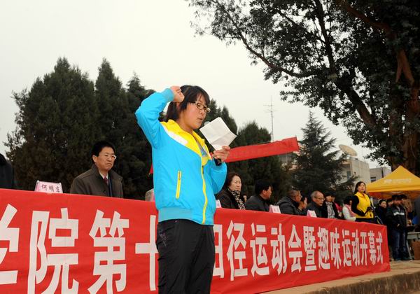 2013年12月11日至13日,我院第十届田径运动会暨冬季趣味运动会在小哨校区成功举行。党委书记崔金赋、党委副书记赵刚、副院长何明东、副院长赵莉、副院长俞浩、院长助理田应华等院领导出席开幕式。开幕式由何明东副院长主持。