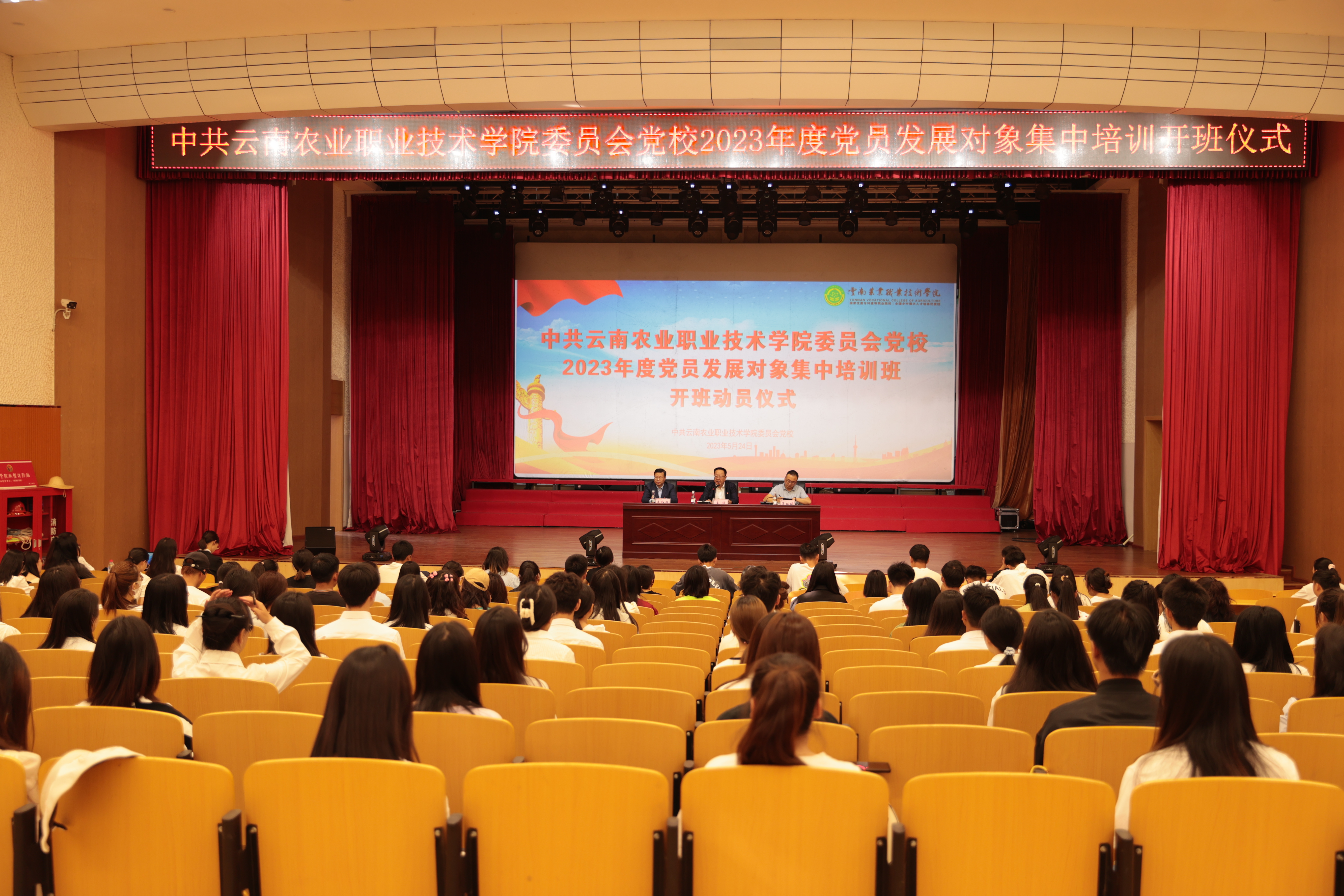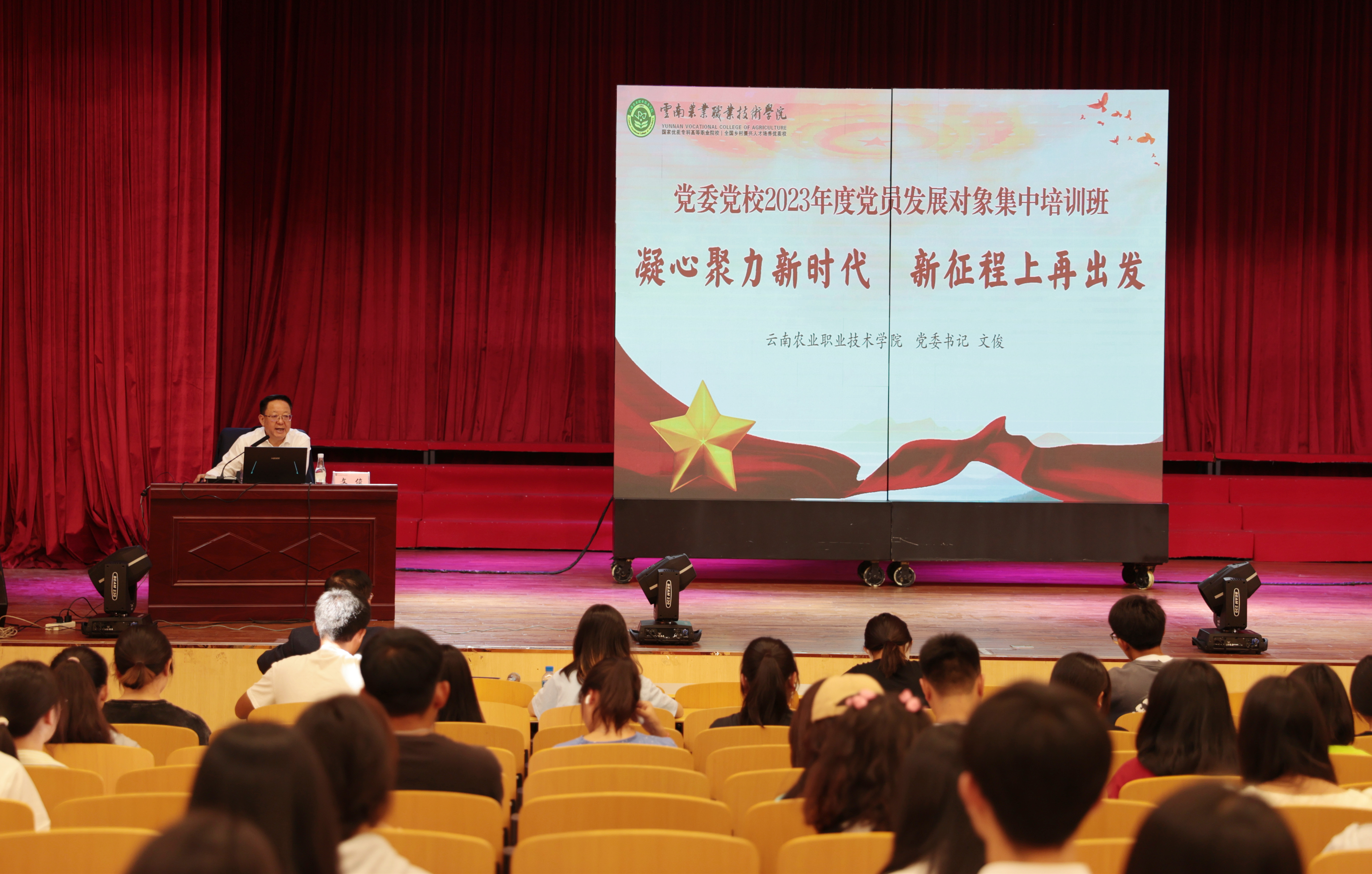 为把学习贯彻习近平新时代中国特色社会主义思想主题教育走深走实走心,确保发展党员质量,学院党委党校于5月24日至26日在小哨校区蚕桑礼堂组织开展2023年第一期党员发展对象集中培训。参加此次培训的学员覆盖小哨、茭菱和云安3个校区师生,共有243位学员参训。党校校长、党委书记文俊出席开班仪式并作动员讲话,开班仪式由党委委员、组织部部长夏体韬主持。