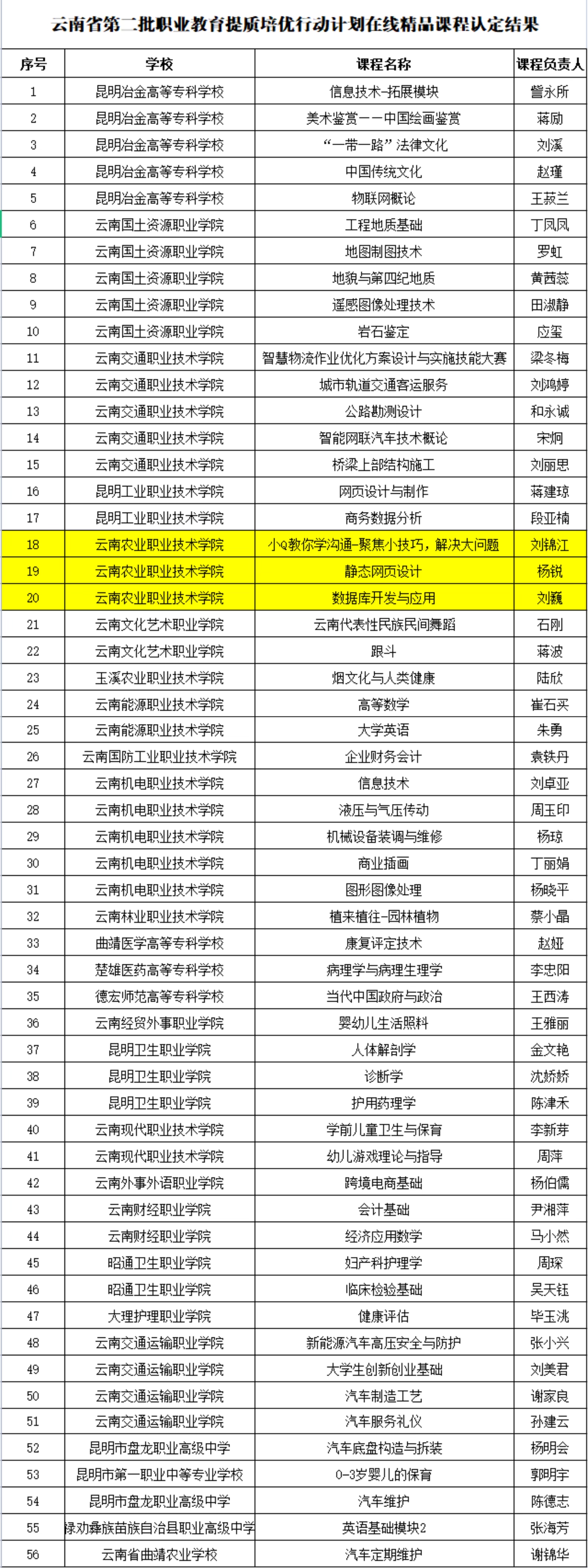 通知中心近日,云南省教育厅公布第二批职业教育提质培优行动计划在线精品课程认定结果,我院杨锐老师主持的《静态网页设计》、刘巍老师主持的《数据库开发与应用》、刘锦江老师主持的《小Q教你学沟通-聚焦小技巧,解决大问题》3门课程被认定为职业教育提质培优行动计划在线精品课程。