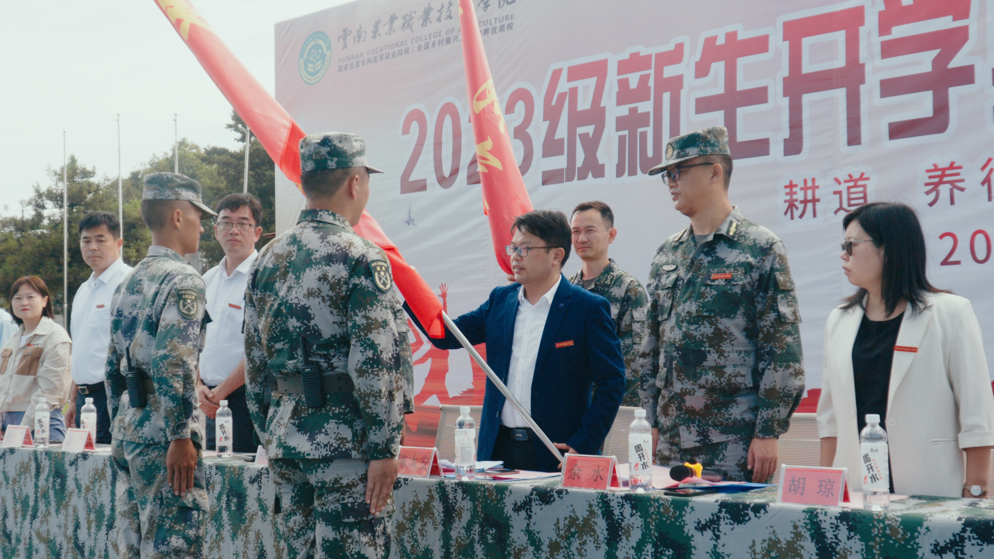 活动在庄严的国歌声中拉开序幕,我校党委副书记、院长陈太安发言。在回顾“云农职”办学百年辉煌历程、介绍两校区办学特色后,陈院长勉励同学们永葆今日探索之蓬勃朝气与奋发意气,传承弘扬“知农爱农、求真务实”百年校风,积极践行“农业+”与“+农业”的人才培养改革理念,铸就“云农职”立德树人金字招牌。同时,他要求带训老师以身作则,发挥好模范作用,与新同学们共同上好军训这一堂“大思政课”,以青春绚丽之花绽放,点缀学校育人新篇章。