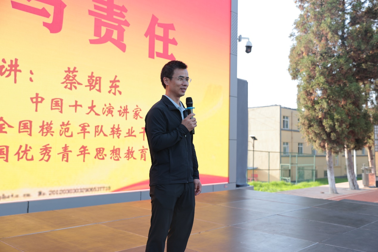 通知中心9月9日,在新生军训期间,学院邀请到“全国模范军队转业干部”、全国著名演讲家蔡朝东老师走进小哨校区,为2023级新生带来震撼人心的演讲报告《信念与责任》,为新生们带来了一堂触动心灵的思政大课。报告会由党委副书记伍学龙主持。