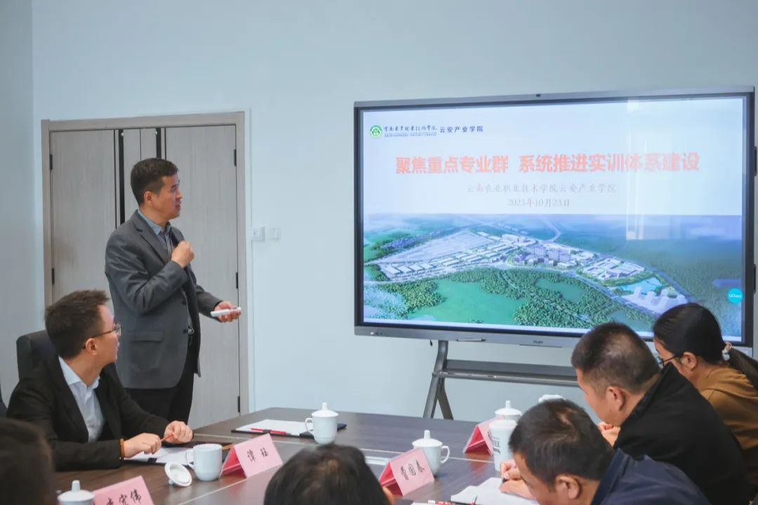 随后,一行人在安宁校区综合调度指挥中心召开了实训体系建设专题工作会议。云安产业学院院长徐红卫作了题为“聚焦重点专业群 系统推进实训体系建设”的汇报,介绍了酒店与餐饮管理,设计与园林工程两大重点专业群的建设规划,分析了实践教学与就业服务统筹发展的优势意义,说明当前实训体系组织机制、师资队伍和资源平台等建设情况。与会人员就云安产业学院实训体系建设问题进行深入交流。