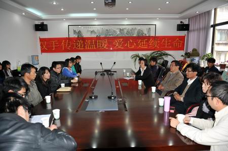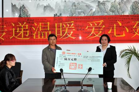陆建辉的父亲介绍了家庭情况和治疗情况,他说,对于他这种家庭承担起高昂的费用是不可能的,本来想着放弃,但那毕竟是自己的孩子。同时,在治疗的这段时间学院的领导、师生都非常关心陆建辉的病情,多次打电话慰问!在学院的有关部门的倡议下,学院发起了对陆建辉同学的爱心捐款活动,更加坚定了为儿子做手术的决心!他代表全家成员对全院师生表示感谢!陆建辉同学在医院委托班上同学表达了对学院师生的感谢,对生命、生活的热爱,表示要勇敢坚强地接受换肾治疗的挑战,尽快回到学院大家庭!随后,陆爸爸含泪接过学院的爱心善款6万元,并向学院赠与锦旗!