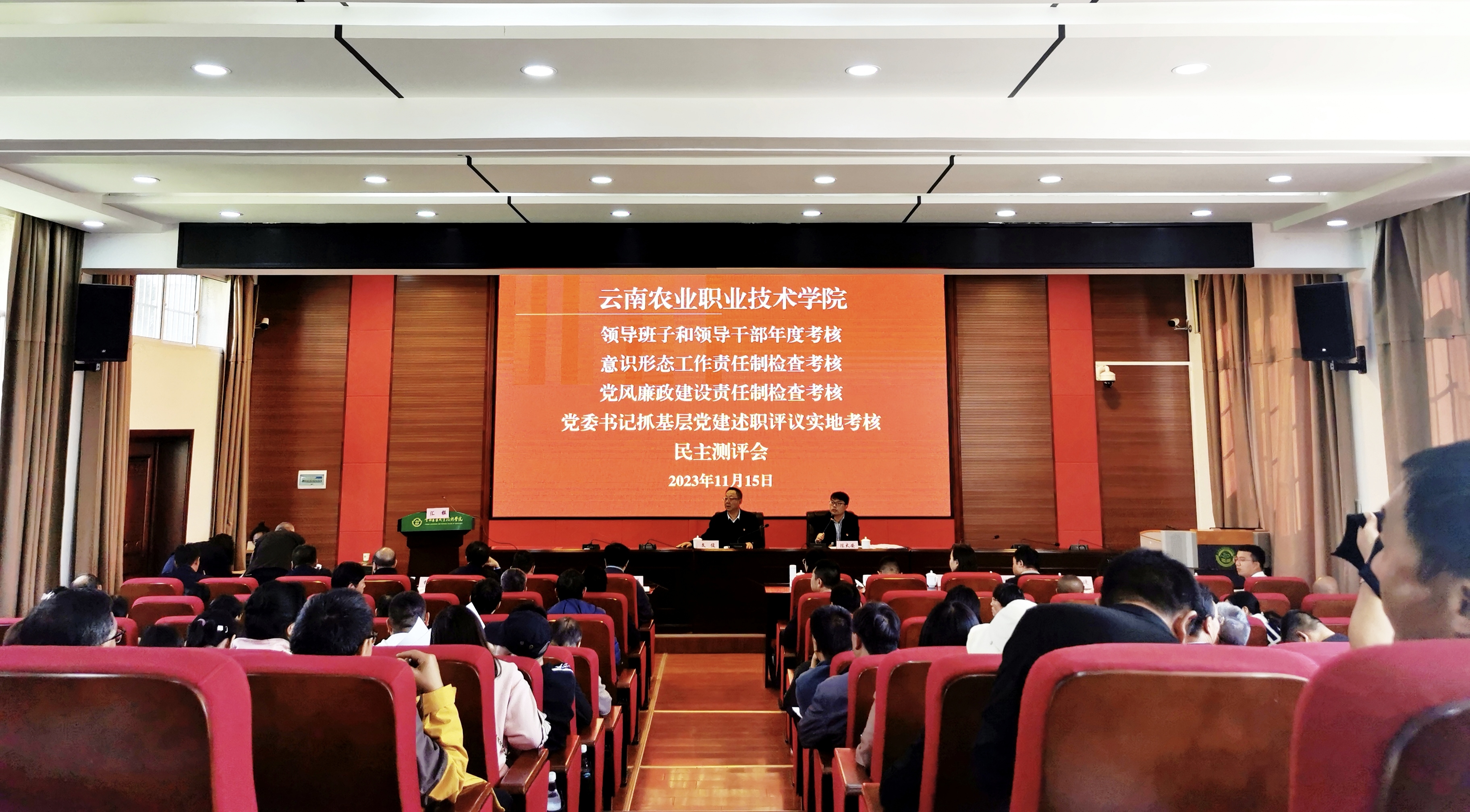 考核过程中,在小哨校区嘉锐阶梯教室召开会议,进行总结述职和民主评议。会议由学院党委副书记、院长陈太安主持。学院党政领导班子成员、中层干部、党代表、人大代表、政协委员、民主党派人士、离退休老干部、一般干部和教职工代表等参加会议。