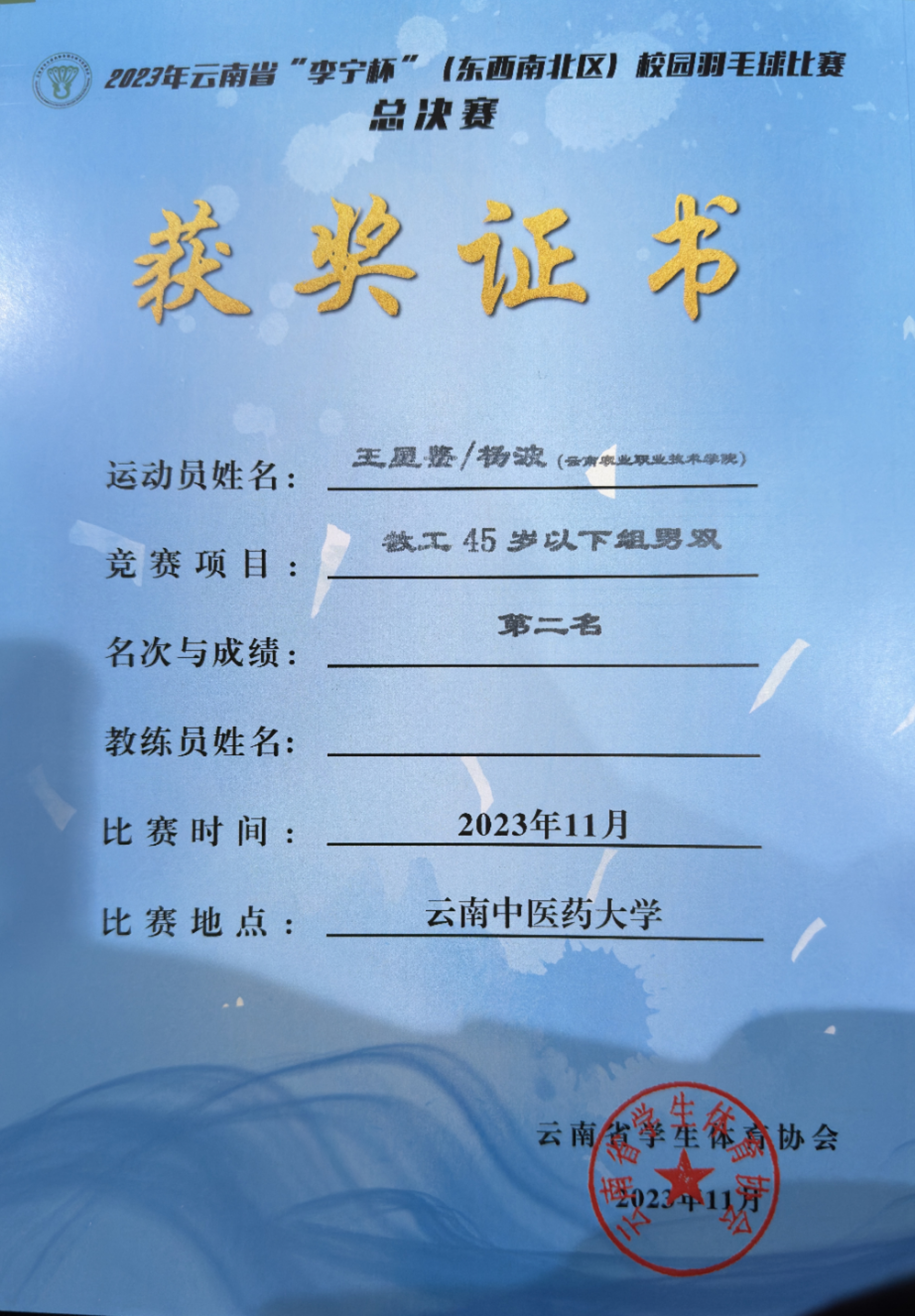 通知中心11月18日,在2023年云南省“李宁杯”(东西南北区)校园羽毛球比赛中,我院代表队杨波副院长和王星鉴老师凭借精湛的技艺和团队精神,成功斩获第二名的优异成绩。