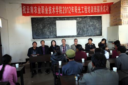 富民县委副书记汪宁代表县委县政府感谢我院的大力帮助,感谢我院领导和老师带着满腔热情与诚意,带着知识技术来帮助农民兄弟;希望富民县与我院进一步加强合作;希望各位学员经常与授课老师保持联系,并把所讲授的实用科技带到生产中,提高生产水平,努力致富奔小康!