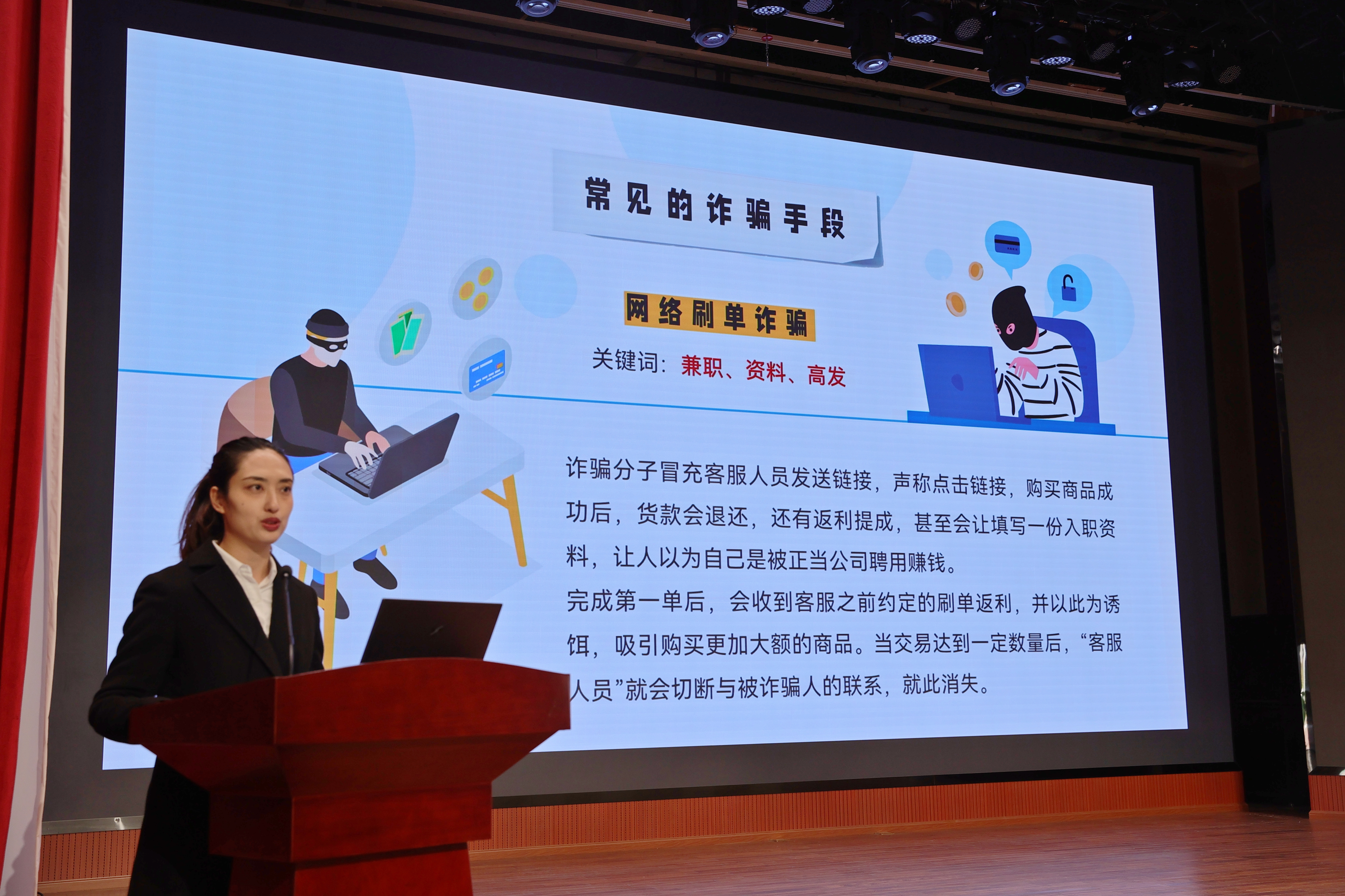 工商银行大观支行个人金融业务部风险经理刘丹为大家带来了一场生动地防诈反诈科普课堂宣讲。宣讲中,她深入浅出地解析了网络刷单、兼职诈骗、校园贷等常见诈骗手段,揭示其背后的贪小便宜、虚荣心理等受骗原因。并对防诈骗提出了几点建议,一是不贪图便宜或无端恩惠;二是要提高防范意识,提升辨别能力;三是要正确处理人际关系;四是不感情用事。她举真实案例,用诈骗方法与典型案例相结合的方式,给大家传经送宝,送上了一系列的防骗提醒。她特别强调了何为帮信罪,以及其背后的法律后果,引导大家树立正确的法律观念。宣传活动中,我院同学认真聆听,展现出当代大学生的责任与担当。此次宣讲活动在反电信诈骗电影《巨额来电》的放映中圆满结束。影片中的诈骗案例,让我们深刻理解了诈骗的危害,也更加坚定了我们防范诈骗的决心。