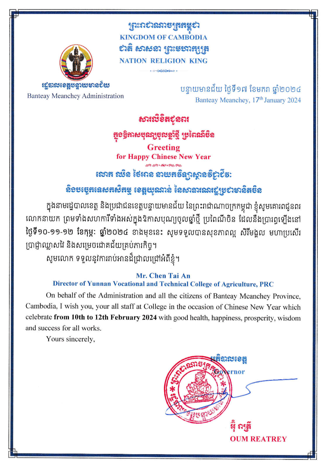 值此中国2024年传统春节即将到来之际,我代表柬埔寨王国班迭棉吉省政府和班迭棉吉省全体人民,向院长先生和学院全体教职员工致以节日的问候!祝您们新春快乐,身体健康,万事如意!