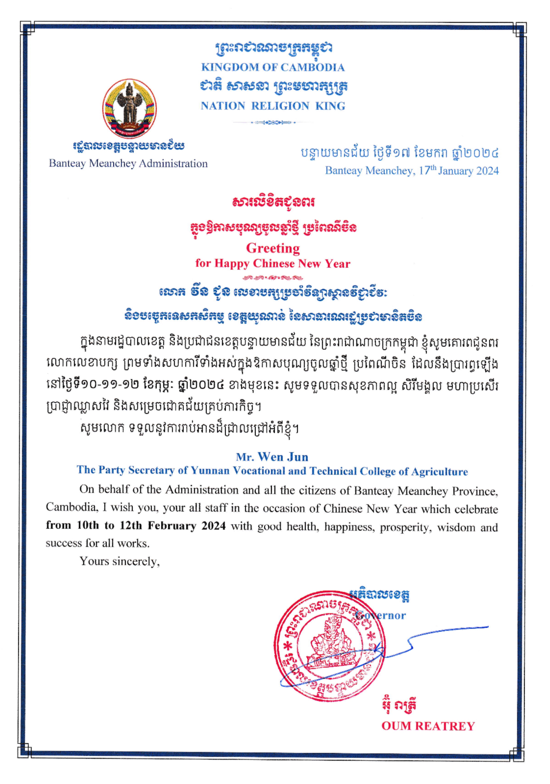 值此中国2024年传统春节即将到来之际,我代表柬埔寨王国班迭棉吉省政府和班迭棉吉省全体人民,向书记先生和学院全体教职员工致以节日的问候!祝您们新春快乐,身体健康,万事如意!