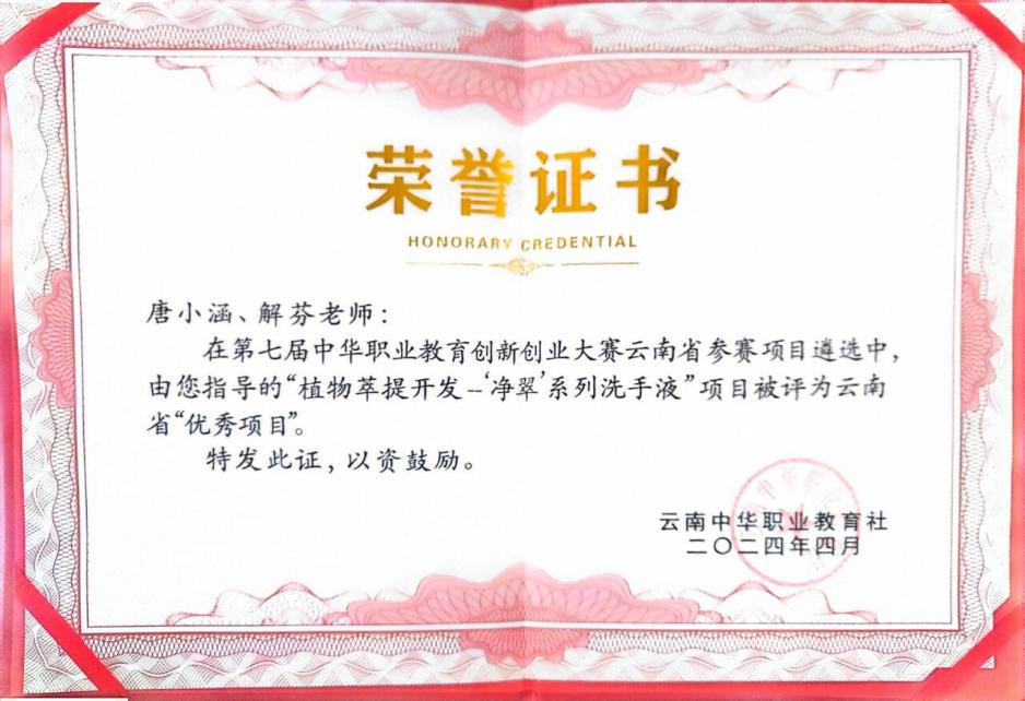 该项目由唐小涵、解芬老师精心指导,团队成员包括蒋玉娟、李杰、严小羽和李玉轩四位同学。项目以云南特色香料迷迭香及香叶天竺葵的开发利用为切入点打造洗手液产品,不仅体现了学院在创新创业教育方面的不懈努力,也充分展示了师生们勇于探索、敢于创新的精神风貌,同时彰显了植物萃提技术在日用品开发中的巨大潜力和市场前景。
