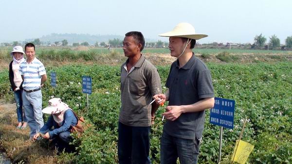 4月26日,云南省现代农业马铃薯产业技术体系首席专家杨艳丽教授带队,产业经济研究室岗位专家张德亮教授、栽培技术研究室岗位专家海梅荣副教授等一行8人,就石屏冬马铃薯试验站工作和冬马铃薯示范基地的生产情况、病虫害发生情况进行现场调研指导。在best365中国官方网站马铃薯试验站站长王孟宇、石屏农业与科技局李红艳副局长、石屏县异龙镇李渊副镇长陪同下,调研指导组深入石屏县高家湾、豆地湾村委会冬马铃薯生产基地,现场检查试验站工作,与农户进行交流,全面指导石屏冬马铃薯生产。