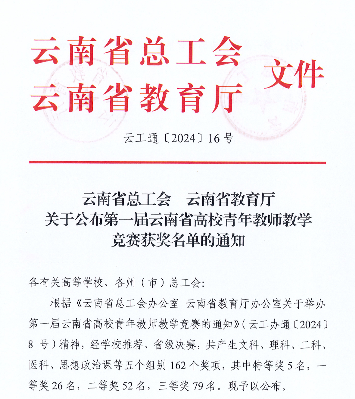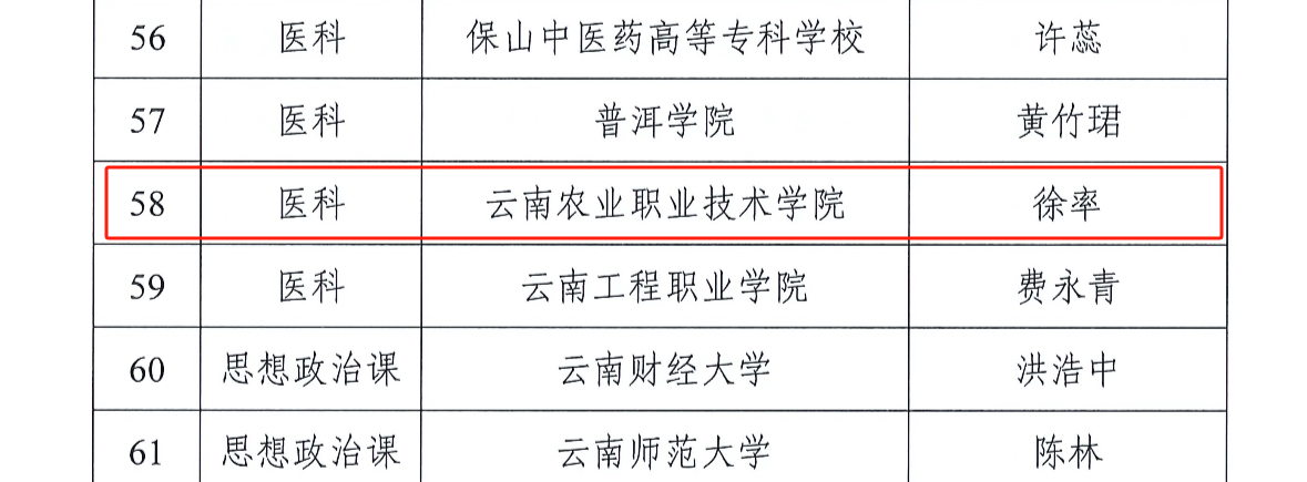通知中心近日,云南省总工会、云南省教育厅公布第一届云南省高校青年教师教学竞赛获奖名单,进学校推荐、省级决赛,共产生文科、理科、工科、医科、思想政治等五个组别162个奖项。我院教师王瑾雯荣获理科类二等奖、孙葳荣获工科类二等奖、徐率荣获医科类三等奖。
