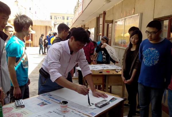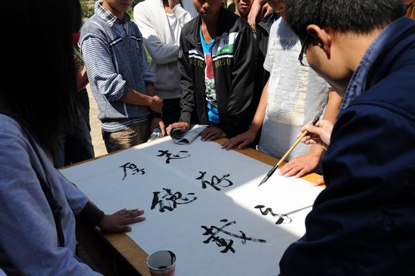 学院党委宣传部副部长蔡永生在现场指导,并挥毫示范。(生物工程系供稿)