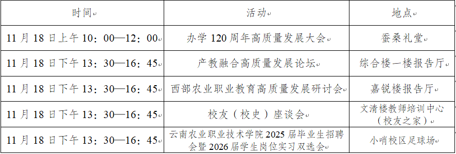 力拓深耕展新猷,继往开来谱新篇。办学120周年是学校发展历史上具有里程碑意义的重要时间节点,更是承前启后谱写云南农业职业教育新篇章的重要起点。现系列活动已准备就绪,热忱欢迎各界宾朋、广大校友相聚农职,畅叙情谊、同襄盛举、共谱华章。特此公告,敬祈周知。