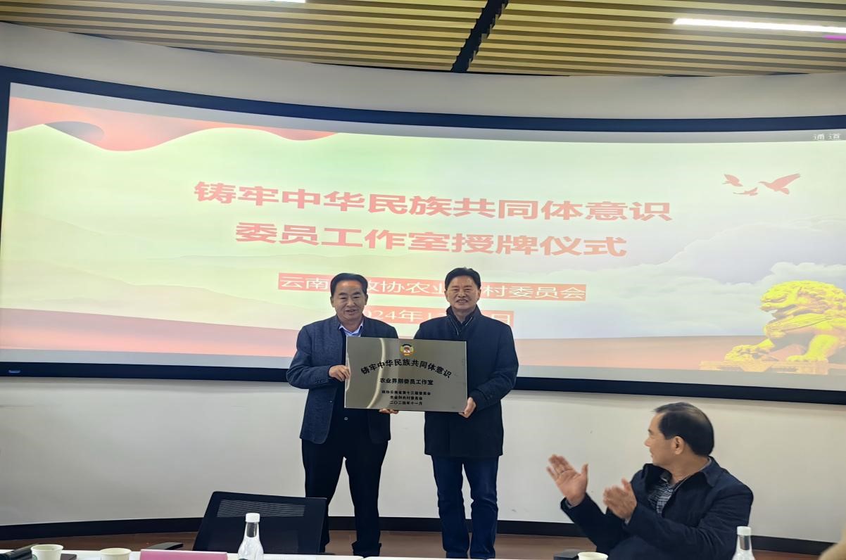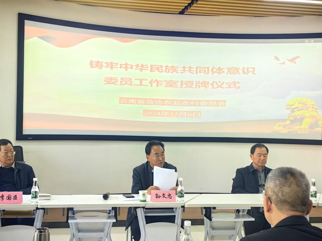 省政协常委、省政协农业和农村委主任孙文忠为“铸牢中华民族共同体意识”委员工作室授牌,田应华委员代表学校接收。
