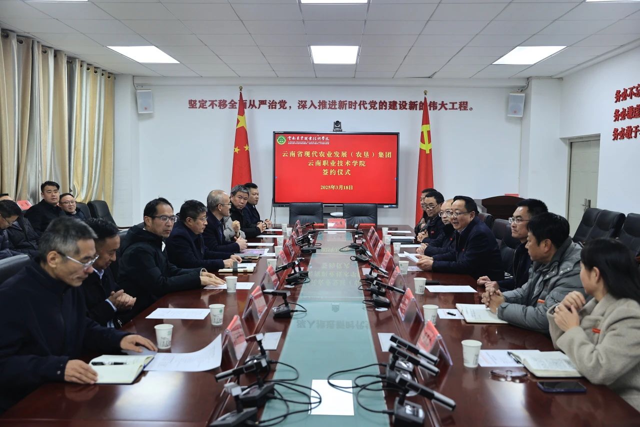 文俊书记表示,党的二十大明确作出产教融合、校企合作的重大部署。深化产教融合也是习近平总书记对职业教育工作指示的重要内容。国家层面已经将产教融合作为职业教育发展和助推产业转型升级的必由之路。在2023年、2024年连续两年召开的全省教育大会上,王宁书记都强调,要围绕重点产业深化产教融合,打造与产业转型升级相适应的职业教育。去年石玉钢副书记分别到农科院和学校小哨校区调研,特别强调农科院、农发集团、农职院等要加强合作,推动“农科农企农教”“三农”融合。为落实省委领导的指示要求,省农发(农垦)集团和学校在多次调研和沟通交流的基础上,共同拟定了《战略合作框架协议》,在双方领导的共同见证下签署了协议。协议的签署是纵深推进云南高原特色现代农业产教融合的一个重要标志,相信在双方的务实合作下,一定能开创农企农教合作助推高原特色现代农业高质量发展的新局面。(办公室供稿/文:刘贵贤、图:张敏/一审:李石友、二审:唐丽群、三审:杨筱莹/一校:刘贵贤、二校:张敏、三校:唐丽群/责任编辑:张敏)