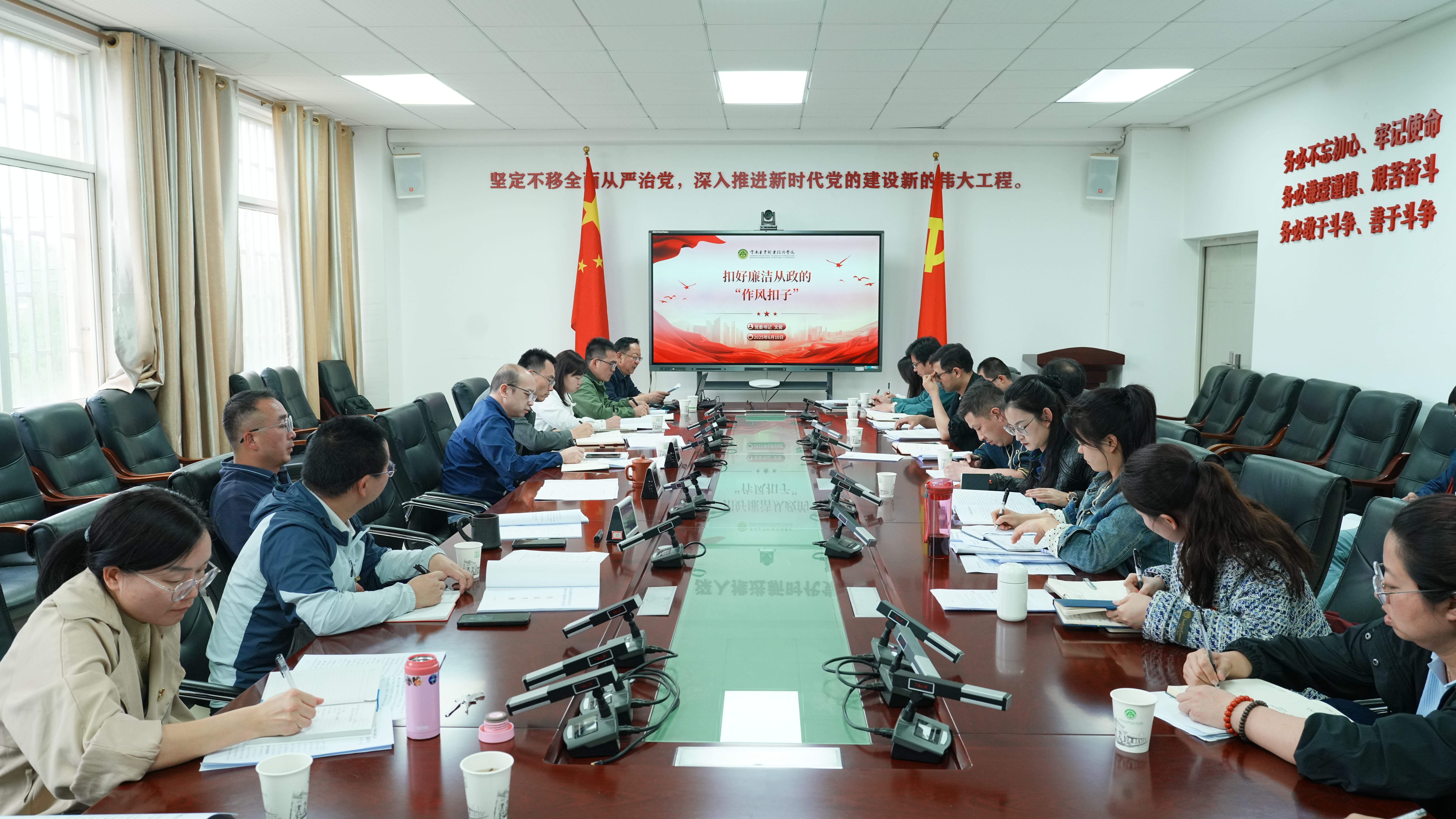 会议最后,文俊书记从一体推进“学查改”开展深入贯彻中央八项规定精神学习教育角度出发,为年轻干部进行专题辅导,并讲授题为《扣好廉洁从政的“作风扣子”》的专题党课。文书记深刻指出,近年来年轻干部“四风”问题呈增长态势,形势严峻。习近平总书记明确要求对新选拔年轻干部违反中央八项规定精神行为一律从严查处、实行“一票否决”。学校突出抓好年轻干部学习教育,就是要让大家自觉锤炼党性、涵养新风,将严的要求贯穿始终,从小事小节做起,严格自我约束,防微杜渐,切实扣好职业生涯的“作风扣子”。他对年轻干部提出三点殷切期望:一是头脑要清醒,时刻保持政治敏锐性,深刻认识到作风建设的重要性;二是手脚要干净,做到廉洁自律,坚决抵制各种诱惑;三是肩膀要过硬,勇于担当作为,在学校发展的各项工作中发挥生力军作用。文俊书记勉励大家,年轻干部是学校发展的生力军和未来,肩负着推动学校事业发展的重任,必须坚守初心使命,不断加强思想淬炼、政治历练、实践锻炼、专业训练,为学校事业薪火相传贡献力量。