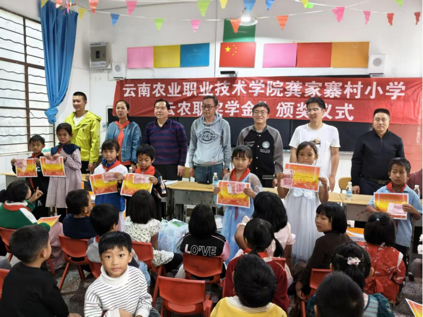 驻村工作队代表学校向获得"云农职奖学金"的同学颁发奖金