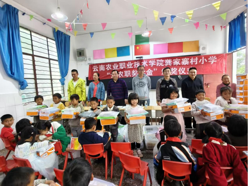 5月29日,在第76个“六一”国际儿童节来临之际,在龚家寨小学举行了隆重的“云农职奖学金”颁奖仪式。驻村工作队的五位教师代表学校向获得一、二、三等奖的同学颁发了奖金,并向全体学生发放了慰问品。这一举措体现了学校对教育事业的关心和支持以及对孩子们的关爱和期望。