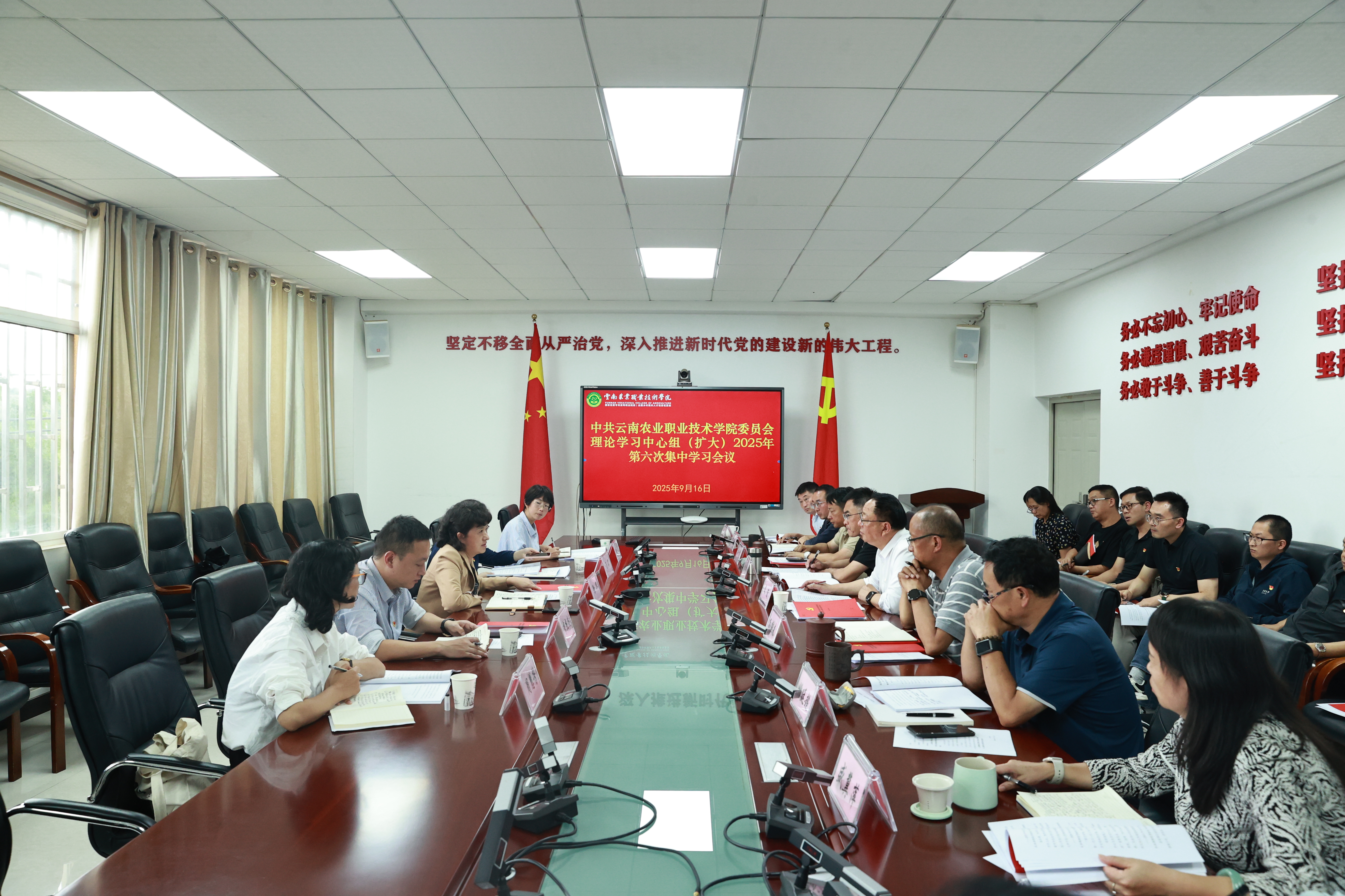 9月16日,学校党委理论学习中心组举行第六次集中学习会议,深入学习领会习近平总书记在纪念中国人民抗日战争暨世界反法西斯战争胜利80周年大会上的重要讲话精神,习近平总书记关于深入贯彻中央八项规定精神的重要指示及中央党的建设工作领导小组会议精神、习近平总书记给全国特岗教师代表的回信。党委书记文俊主持会议并讲话,省委教育工委党委理论学习中心组列席旁听第二工作组到会旁听指导。