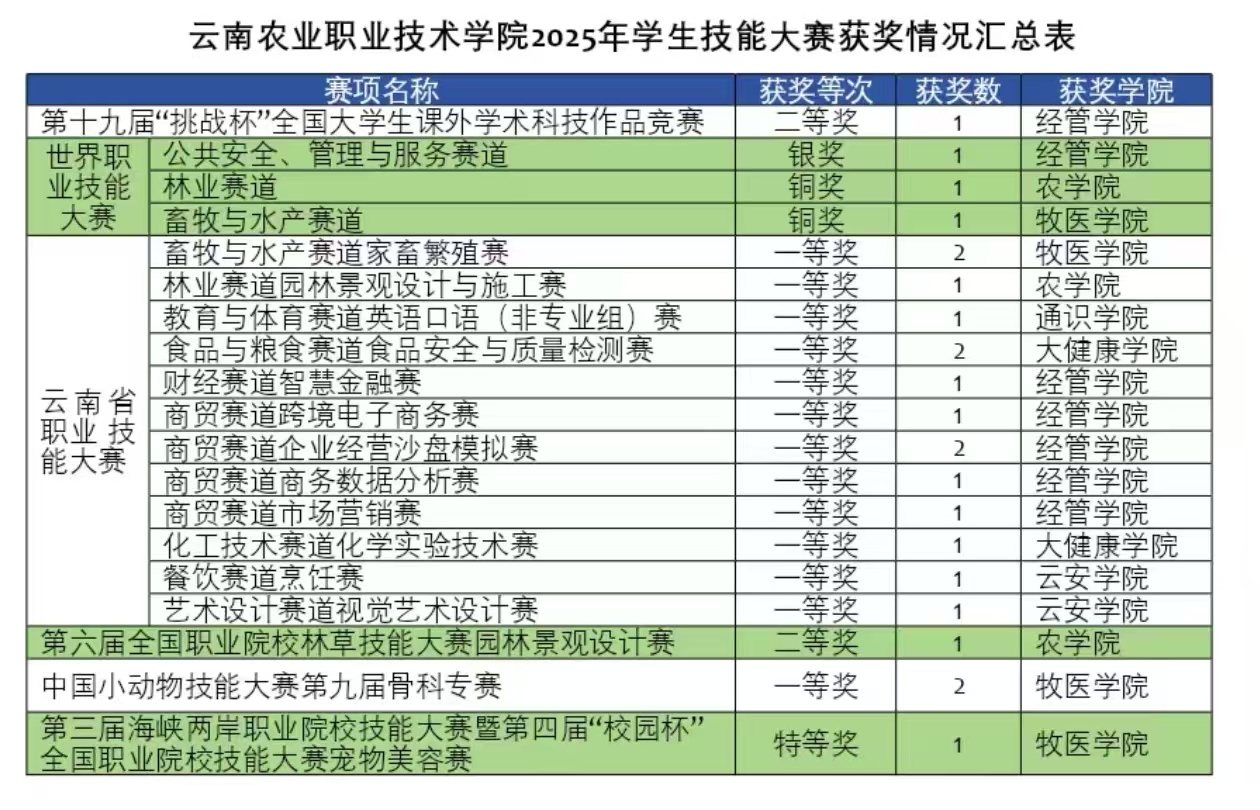 通知中心时至金秋,2025年世界职业院校技能大赛和云南省职业院校技能大赛等比赛相继落幕,best365参赛团队凭借扎实的专业知识、精湛的操作技艺以及默契的团队协作,一路披荆斩棘,斩获多项大奖,充分展示了云农院学子“以技立身、以技赋能”的青春风采,为学校“十四五”的收官工作交上了一份完美答卷。