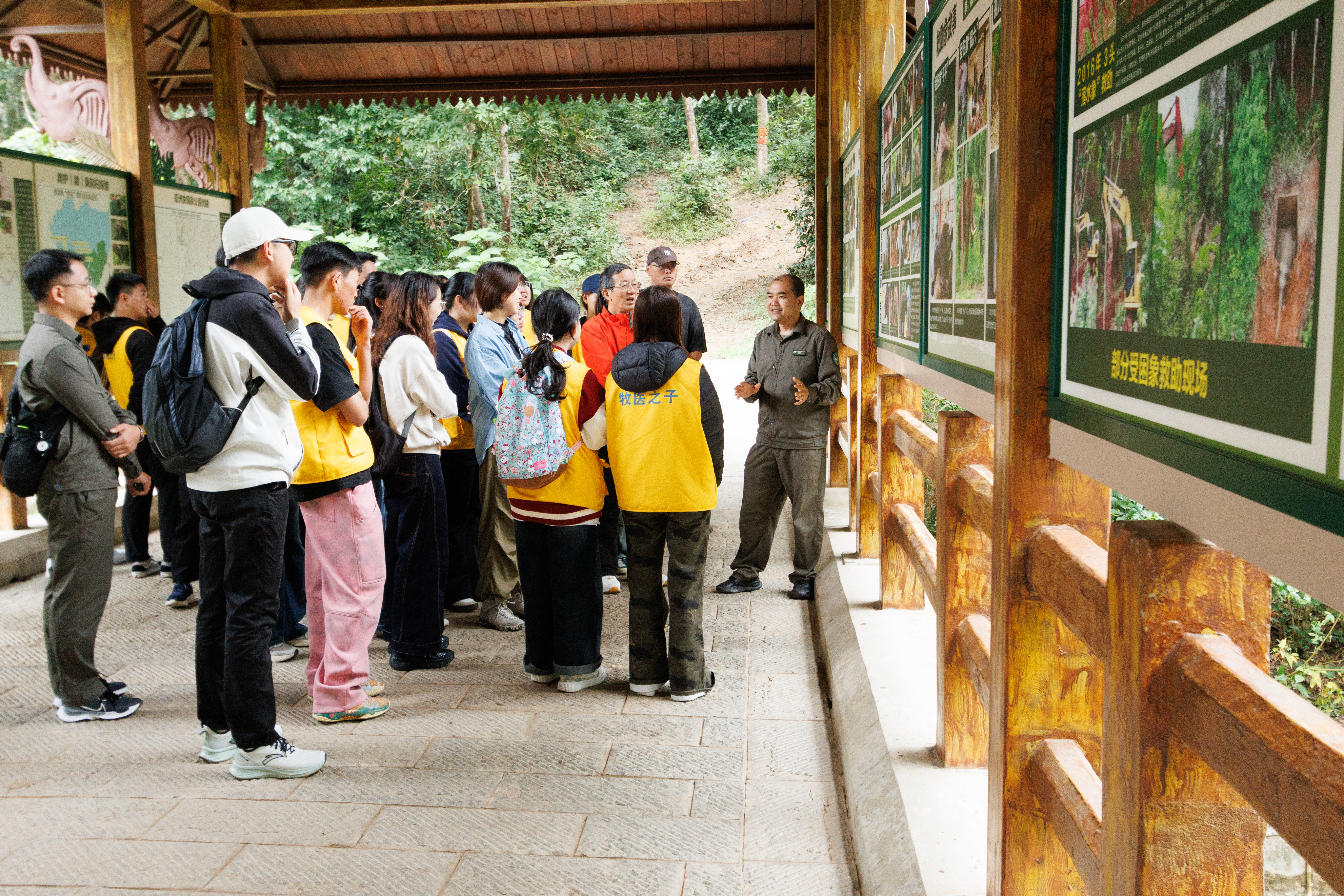 活动期间,师生一行实地走访了亚洲象保护管理中心的监测站、救助站等区域,近距离观摩亚洲象野外监测、救助、栖息地保护等工作流程。全国劳动模范、畜牧兽医学院优秀毕业生保明伟同志结合自身23年扎根边疆、深耕亚洲象保护事业的从业经历,用朴实无华的语言分享了在极端环境下坚守岗位、攻坚克难的奋斗故事,详细讲解了亚洲象行为学研究、种群动态监测、人象矛盾调解等领域的专业知识与实操经验。他始终秉持“守护生态家园”的初心,以精益求精的专业态度、无私奉献的责任担当,在平凡岗位上创造不平凡业绩的事迹,深深打动了在场每一位师生。