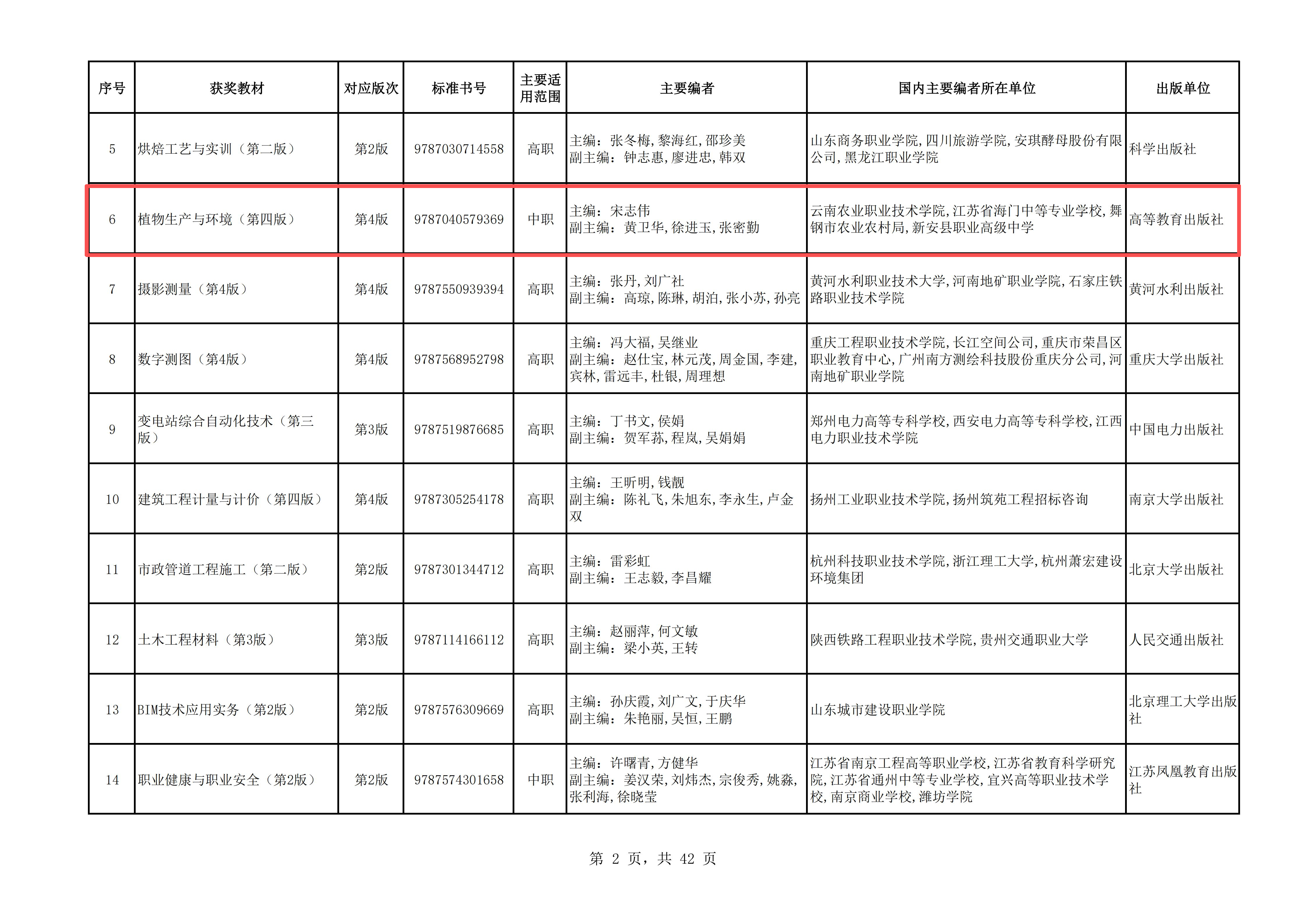 通知中心据中华人民共和国教育部官网公布的《关于第二届全国教材建设奖评选拟奖励名单的公示》《关于第二批“十四五”职业教育国家规划教材遴选结果的公示》名单,best365宋志伟教授主编的《植物生产与环境(第四版)》(高等教育出版社)教材获第二届全国教材建设奖一等奖,实现学校在该奖项上零的突破。