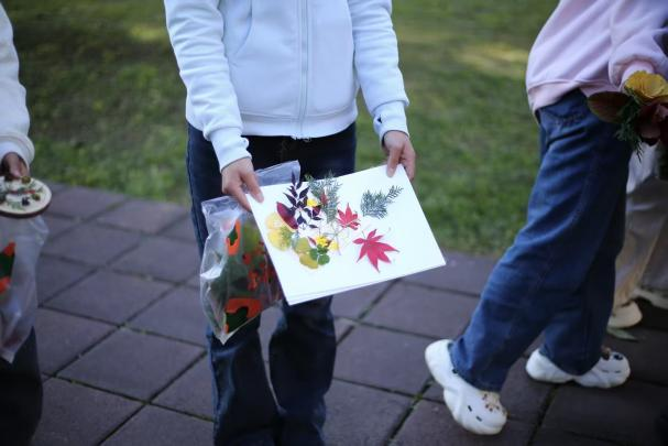 活动现场十分热闹,创作桌上摆满了各种各样的自然材料:火红的枫叶、金黄的银杏叶、宽大的梧桐叶,再加上松枝和野果,成了大家的创作素材。有人用大片梧桐叶做底子,搭配红枫和松枝,用棉线缠绕固定,扎成一束束带着秋意和生机的落叶花束;有人用热熔胶把修剪好的落叶和野果固定在原木片上,做成小巧的桌面装饰摆件;胶片组的同学则把压平的落叶放进透明胶片里封好,边缘系上简单的丝带,做成印着秋景的书签和挂饰,留住落叶的美好。大家专注创作的身影里,藏着把“无用”变“有用”的巧思,彼此交流心得的笑声,给深秋的校园添了不少活力。