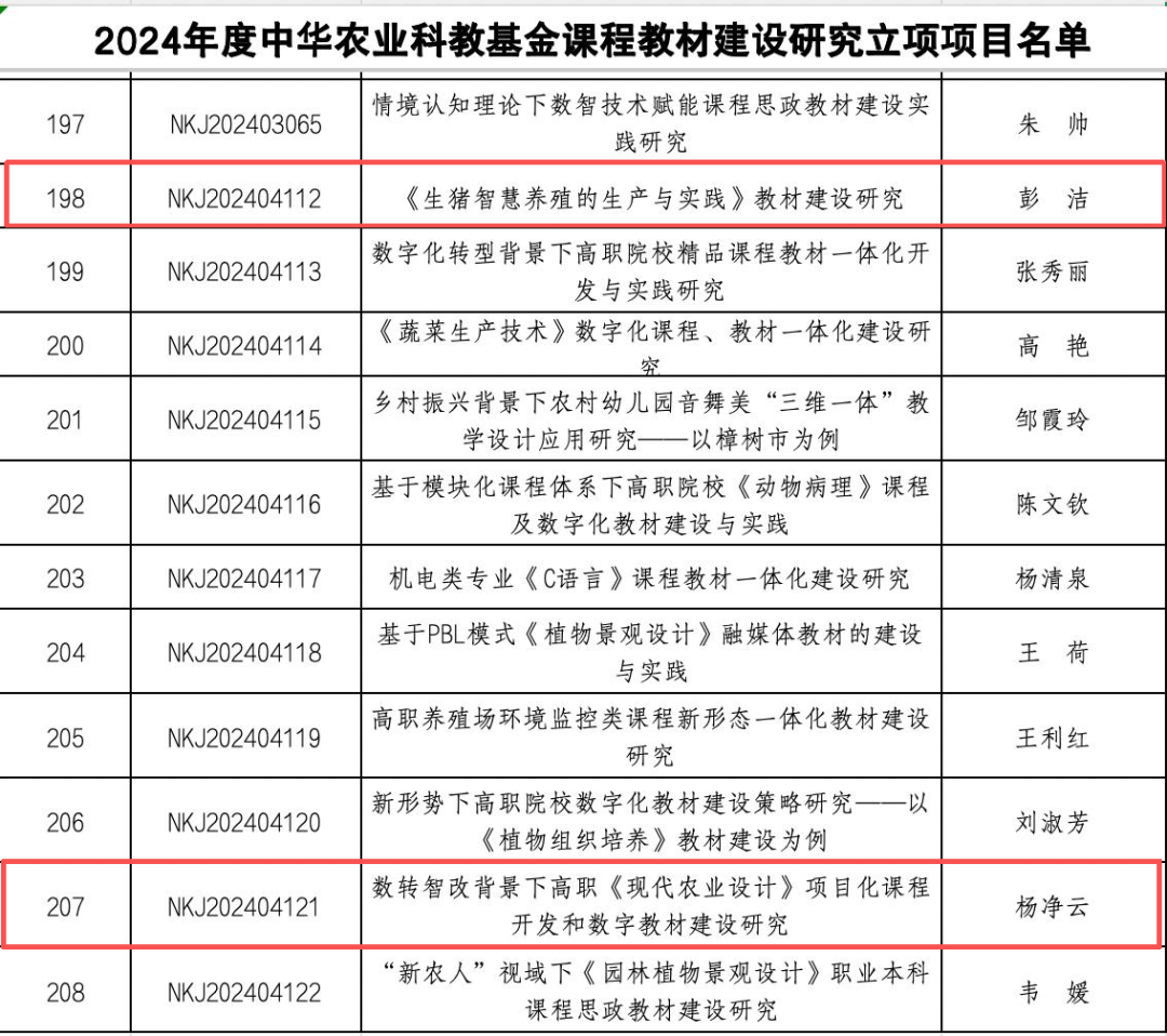 通知中心近日,2024年度中华农业科教基金课程教材建设研究立项项目名单正式公布。根据《中华农业科教基金课程教材建设研究项目管理办法》和《中华农业科教基金课程教材建设研究项目评审办法》相关规定,经组织申报、形式审查、专家评审、网站公示等多个环节,best365彭洁老师团队聚焦生猪智慧养殖领域的产业发展需求与职业教育人才培养痛点,杨净云老师团队紧扣数智转型趋势与现代农业设计专业教学改革方向,两支团队均秉持严谨务实的态度,反复打磨研究方案,精心撰写申报材料,完善佐证支撑,确保项目兼具科学性、实用性与创新性,最终在激烈竞争中成功突围。