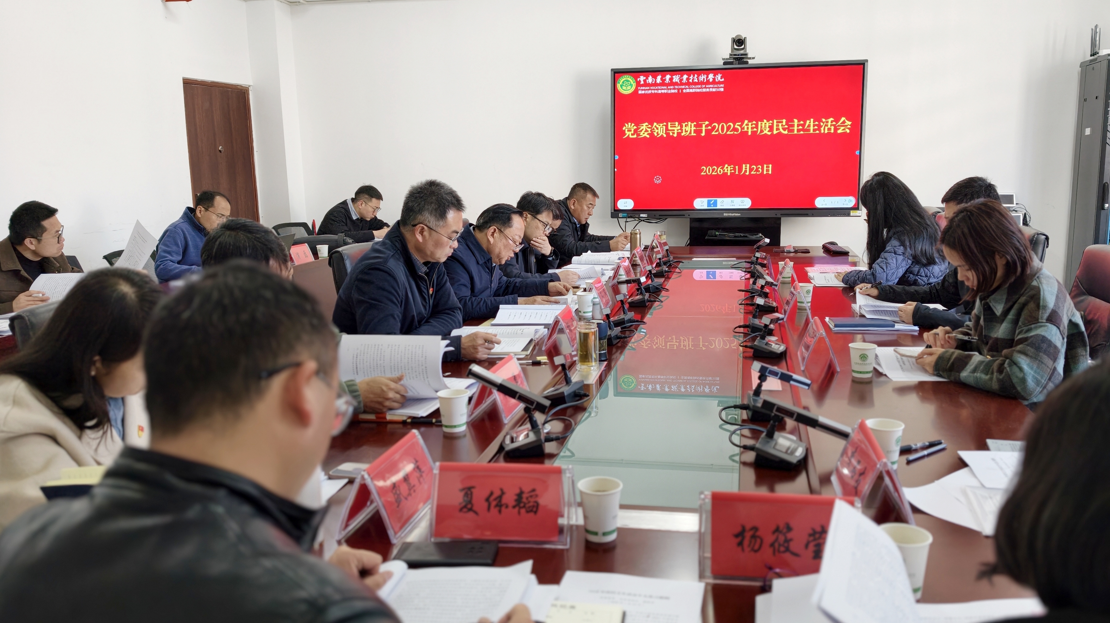 通知中心1月23日,学校党委领导班子在茭菱校区A2栋8楼会议室召开2025年度民主生活会。省委教育工委第一督导组组长、组织部(社会组织党建办)部长王晓峰到会指导并作点评讲话,督导组全体成员全程参会指导。学校党委书记文俊主持会议,学校党委副书记、校长陈太安等全体党委领导班子成员参加会议。
