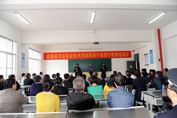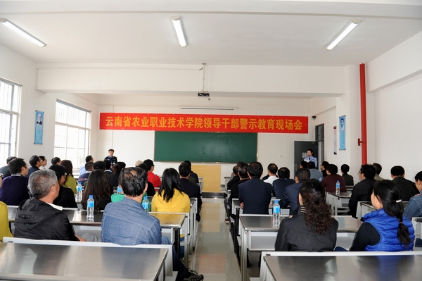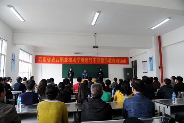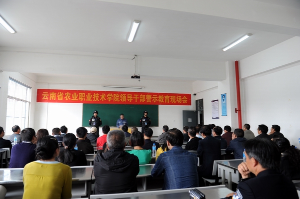 云南省农业职业技术学院领导干部警示教育现场会议由杨林监狱政治处主任尹东斌主持,由三名在押服刑人员进行“现身说法”。服刑人员讲述了他们如何走上违法犯罪的道路,最终身陷囹圄的经过。他们以自己的亲身经历,剖析了犯罪的思想根源,对自己的犯罪行为进行了深刻忏悔。崔书记在警示教育现场会上发表讲话说:活生生的例子,给我们上了一堂生动的警示教育课。他希望学校领导干部通过警示教育活动,明确党委的主体责任和纪委监督责任,强化主体责任意识;通过组织开展领导干部廉政培训,加强政策法规案例教育,防微杜渐做好本职工作。