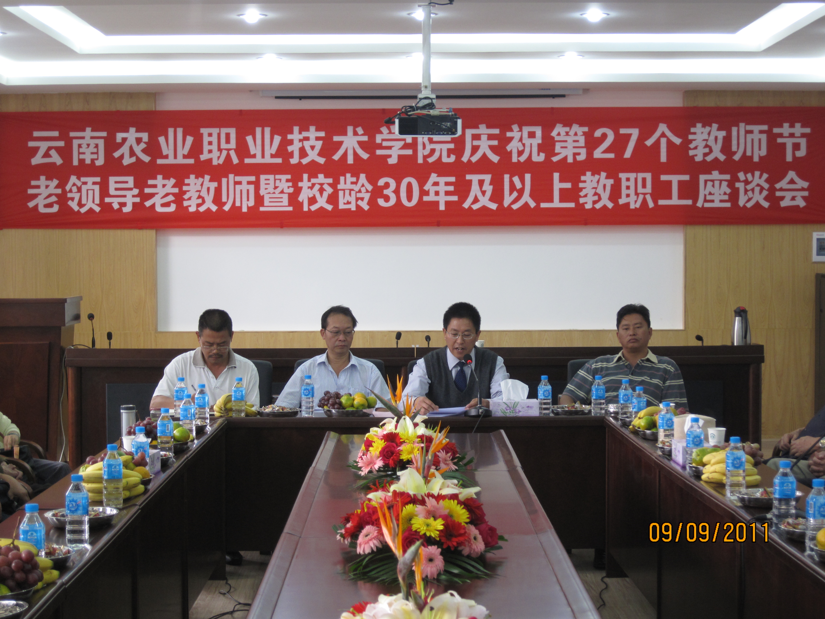 原云南省农业学校时来书记谈到,国家非常重视教育事业,专设一个教师节,就是希望我们更热爱教育事业!学院走过了许多艰辛,学院也一天天发展壮大,我们很高兴!说明学院领导比我们当初付出得更多,感激现任领导使学院日新月异,“青出于蓝而胜于蓝”!希望学院严格要求教师,在关心爱护教师的同时更要提高教师的学识和素养,只有高素质的教师才能培养高素质的人才!原云南省农业学校李铸声校长、陈校长感言,很高兴欢度自己的节日,自己与教育有缘分,一辈子搞了35年教育,很有感情;经常有学生来看望,很有成就感!教师虽然清贫辛苦,但却是天底下最光辉的事业!要抓好教师队伍建设,要抓好学院基本建设,要帮助农村农民增产增收!