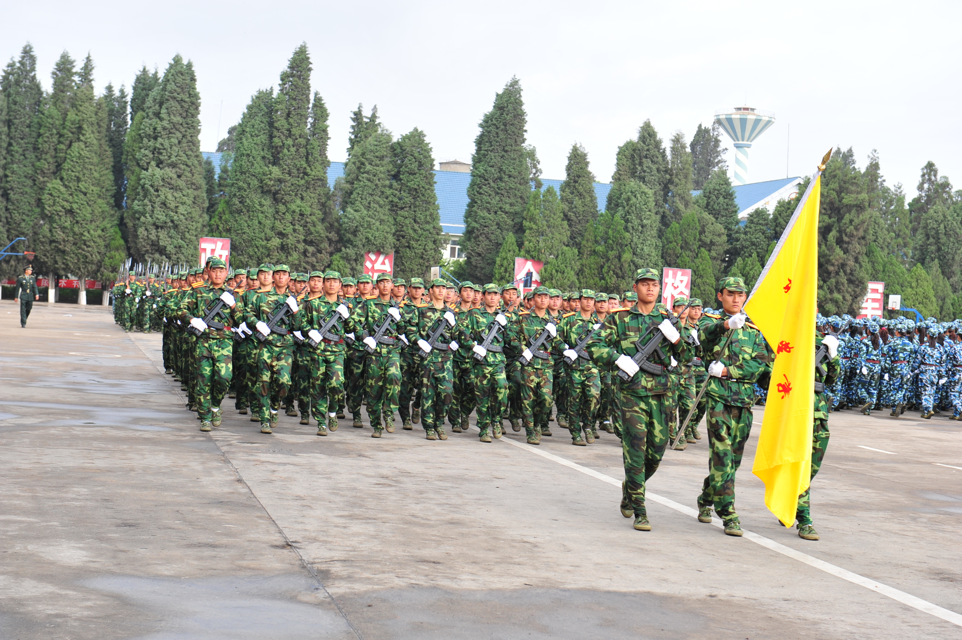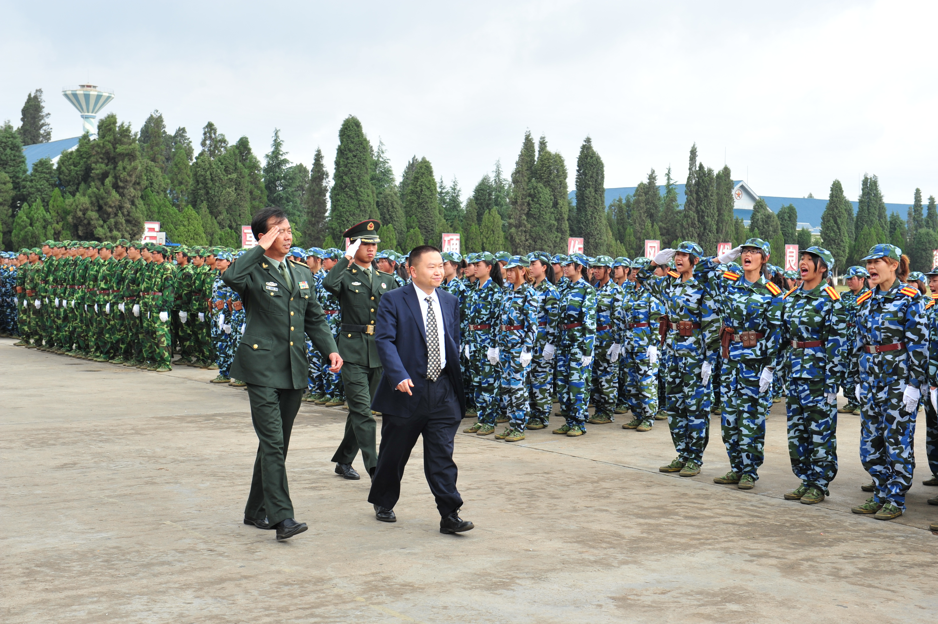 2010年4月29日上午10时,在铿锵有力的解放军进行曲中,全体教官、参训学生迎来了best365中国官方网站院旗,阅兵仪式正式开始。彭志远院长在昆明陆军学院军训办主任田景大校的陪同下,依次检阅了新生军训受阅方队,嘹亮的口号响彻田径场上空。