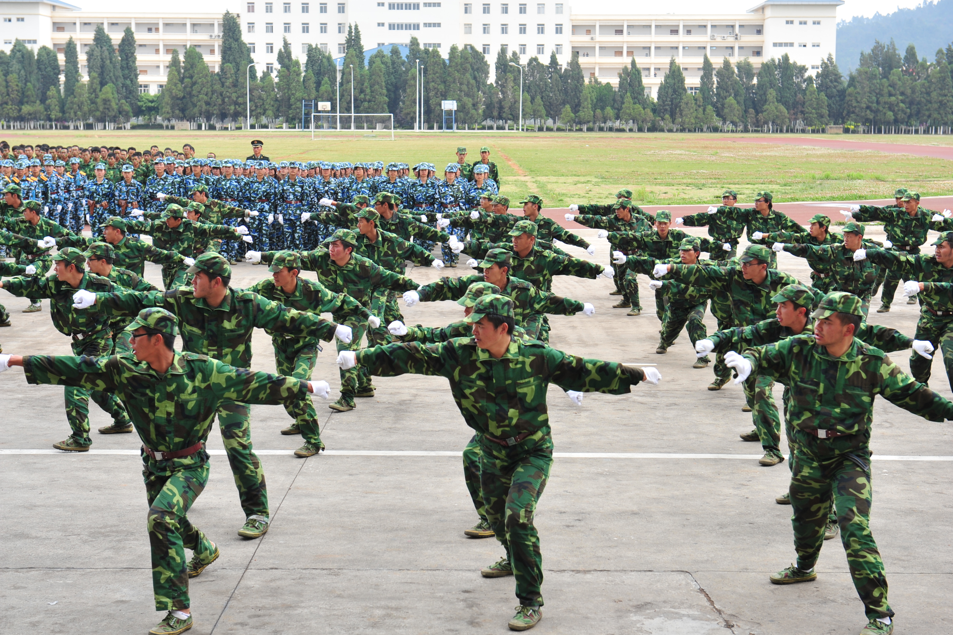 分列式结束后,军体拳表演、队列表演、韵律操、倒功、拉歌表演、花样操等表演方队依次登台亮相,男儿们龙腾虎跃,豪情万丈;女生们也毫不逊色,展现巾帼本色。精彩的表演赢得阵阵掌声。