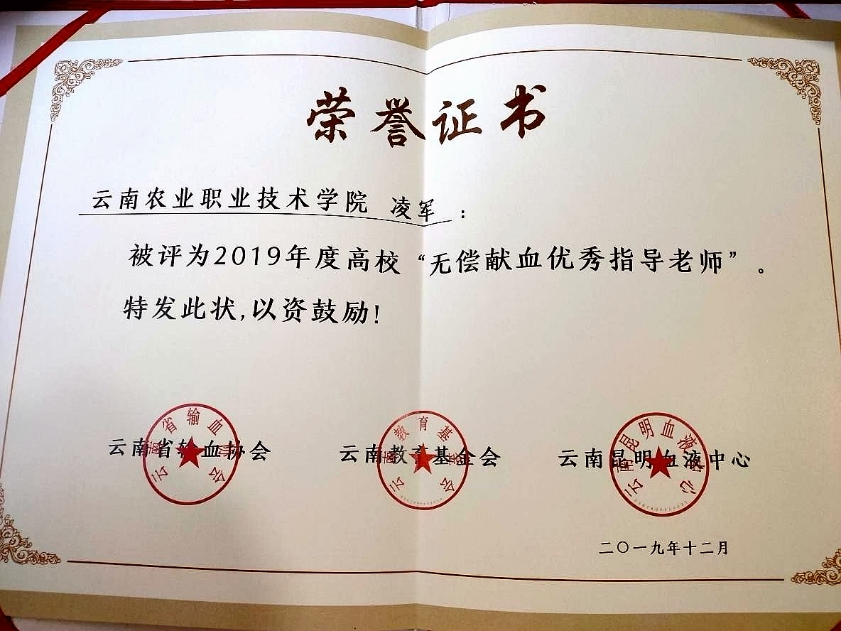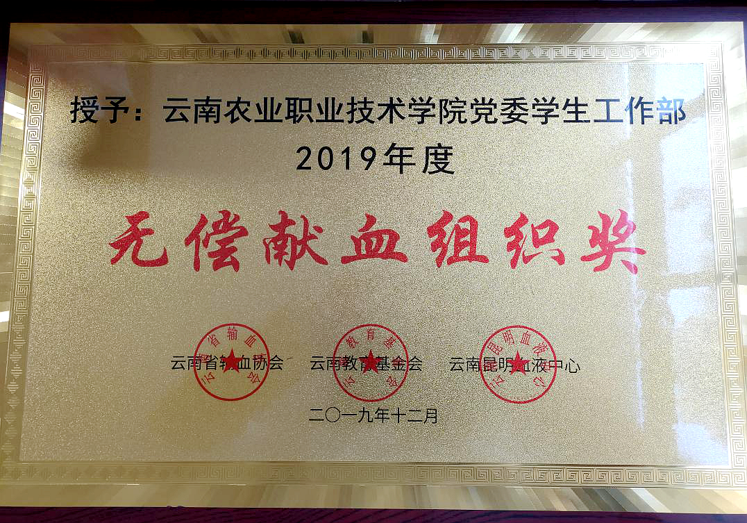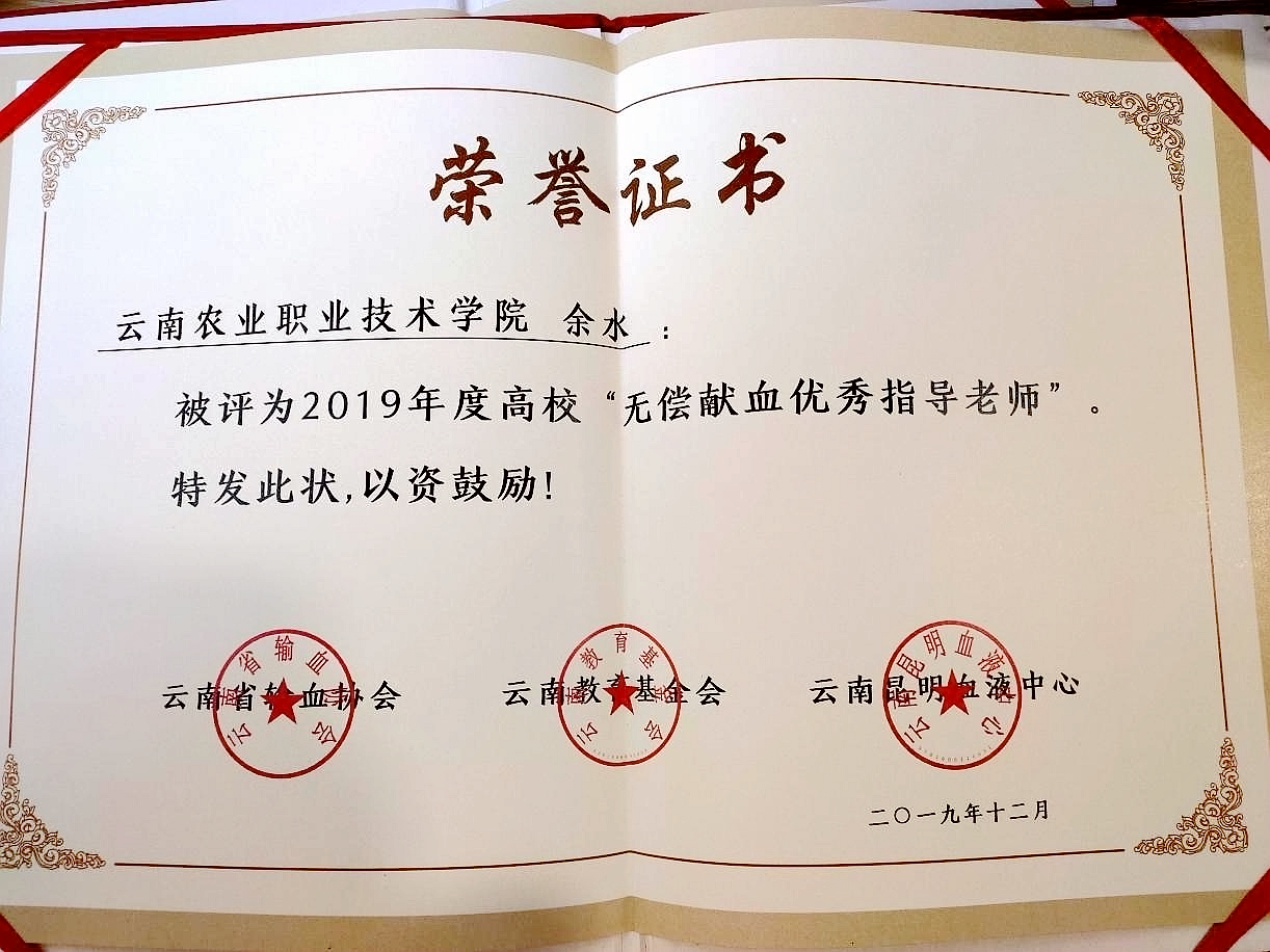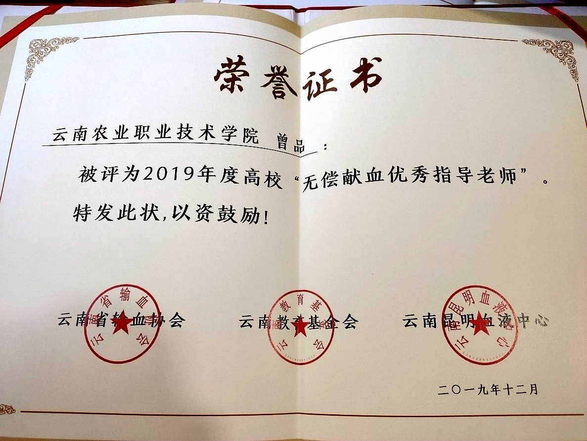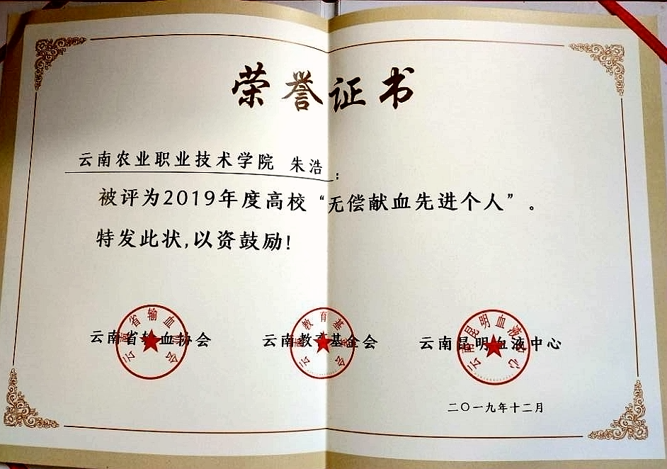 本次会议表彰了昆明地区无偿献血工作中表现突出的集体与个人,我院学生工作部获“2019年度无偿献血组织奖”、获昆明地区无偿献血爱心助学基金16200元,学生工作部部长凌军老师、副部长余水老师、宿管科科长曾品老师和互联网技术学院金菁老师获“无偿献血指导老师” 称号,朱浩等15名同学获“无偿献血先进个人”称号。
