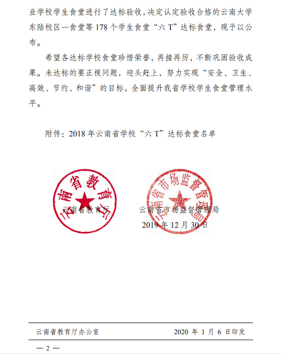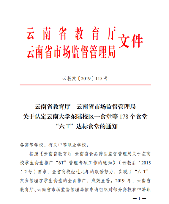 根据《云南省教育厅 云南省市场监督管理局关于认定云南大学东陆校区一食堂等178个食堂“六T”达标食堂的通知》(云教发〔2019〕)精神,学院“田之苑”学生食堂经云南省教育厅、云南省市场监督管理局达标验收,被认定为“六T”达标食堂,这充分体现了学院对学生食堂的管理成效,也是学院后勤服务现代化的重要体现。希望相关部门再接再厉,推动后勤服务管理水平再上新台阶,为实现“安全、卫生、高效、节约、和谐”的后勤服务现代化目标不懈努力!(党委宣传部)