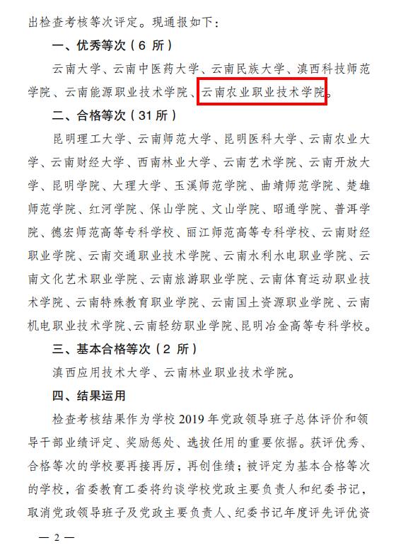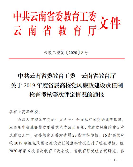 2020年2月25日,中共云南省委教育工委 云南省教育厅通报2019年度省属高校党风廉政建设责任制检查考核等次评定情况,在省属23所本科学校、16所高职院校中,我院被评为6所优秀等次高校之一。