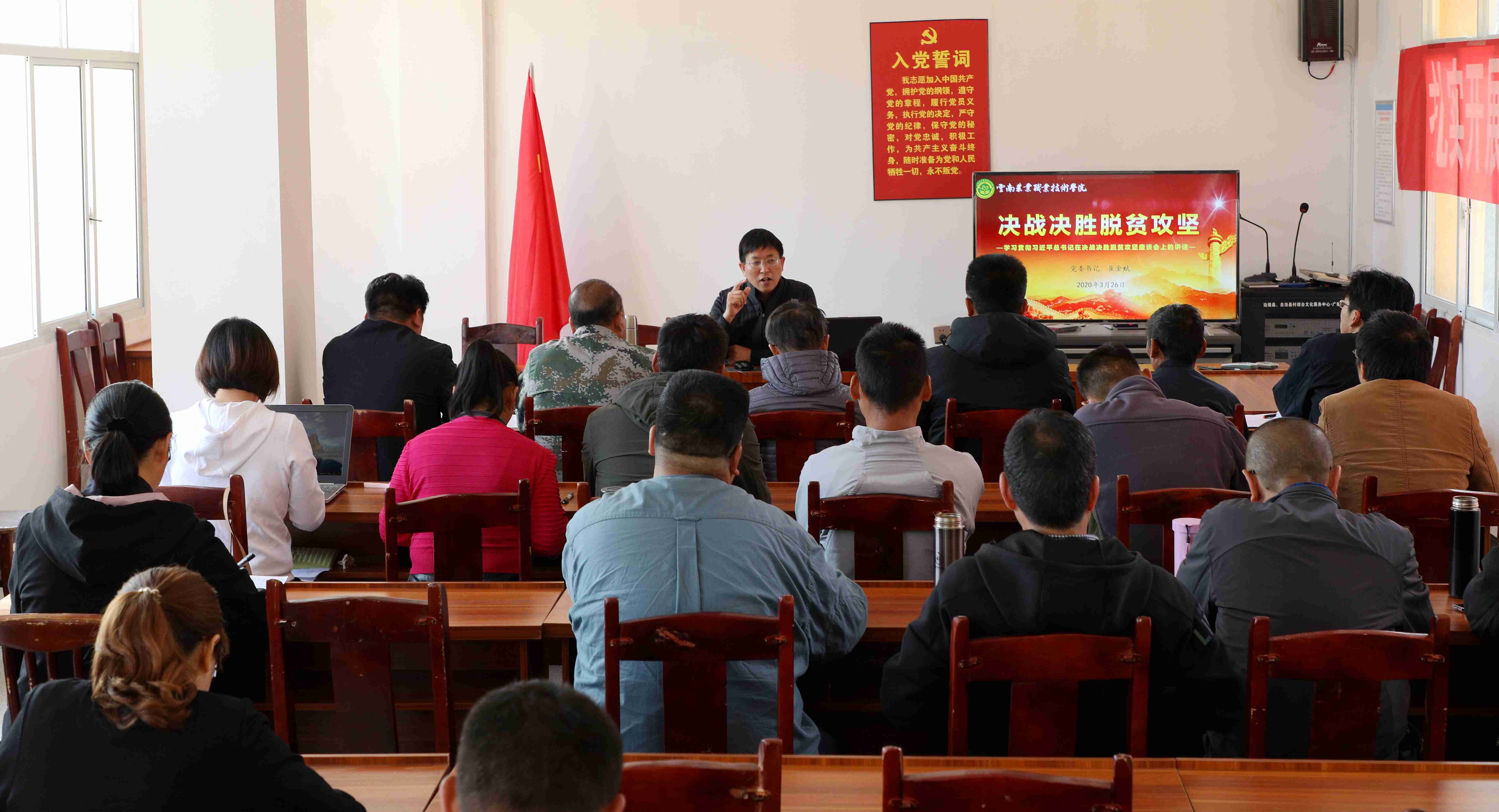 25日,崔金赋书记一行查看了龚家寨村人居环境提升建设情况及学院近年来帮扶项目,参观龚家寨村生态养猪场,走访慰问挂钩帮扶户,帮扶干部仔细了解对口帮扶户的生产生活情况,为精准帮扶,防止返贫打好工作基础。26日,崔金赋书记为大兴乡党委、政府领导干部、龚家寨村委会、扶贫工作队及全体调研走访人员宣讲习近平总书记在决战决胜脱贫攻坚座谈会上的讲话精神,坚决扛起脱贫攻坚政治责任,筑牢决战决胜脱贫攻坚“总攻战”的信心;纪委书记冯志宏同志为全体人员传达《中共云南省委组织部关于发起驻村扶贫“总攻战”决战决胜脱贫攻坚的通知》精神及省纪委驻省教育厅纪检组关于在打赢教育精准脱贫攻坚战中深化腐败和作风问题专项治理的工作部署要求。