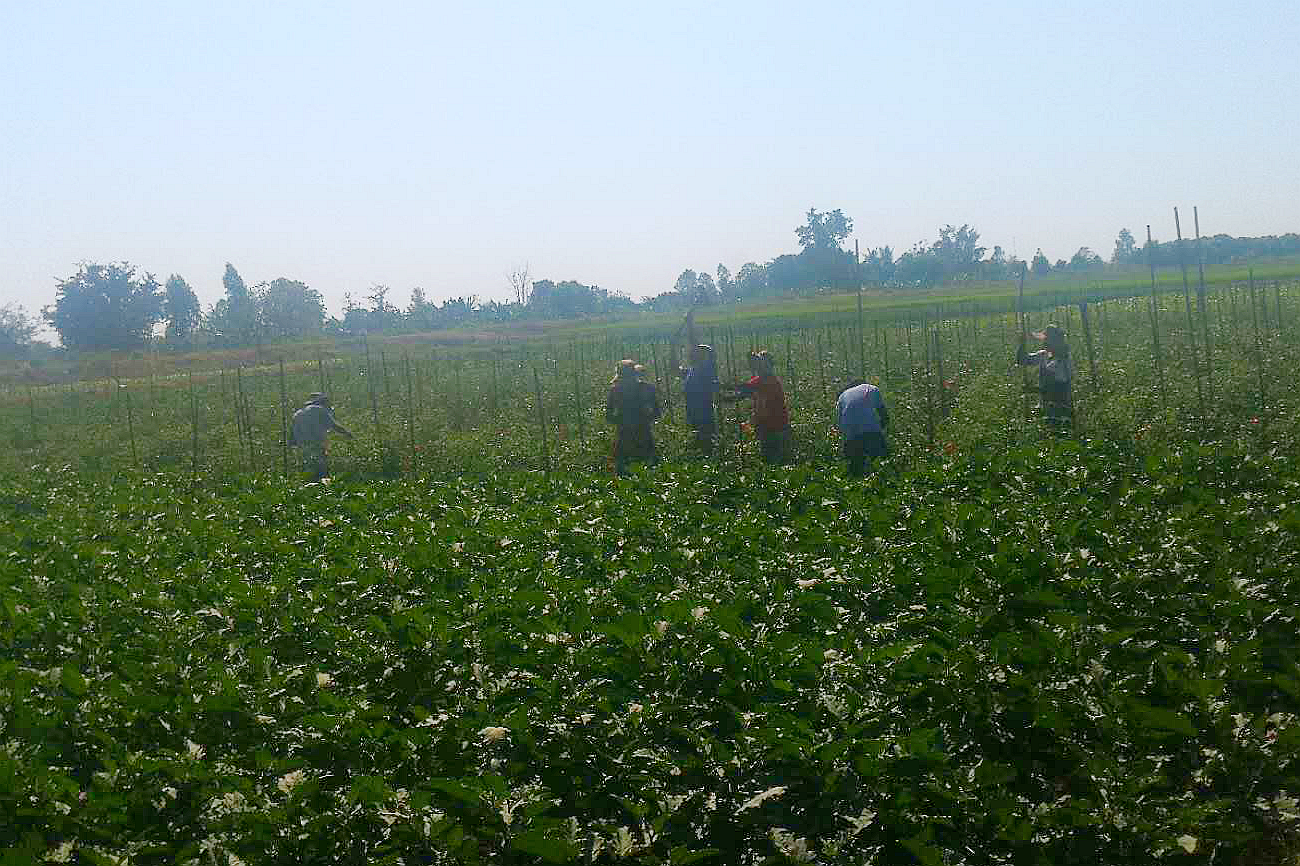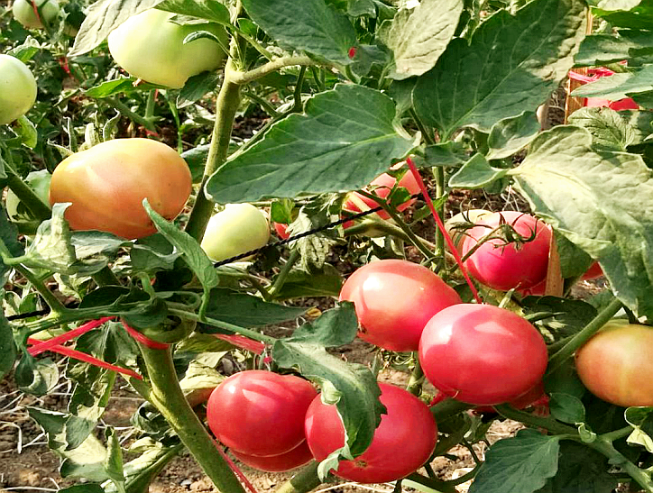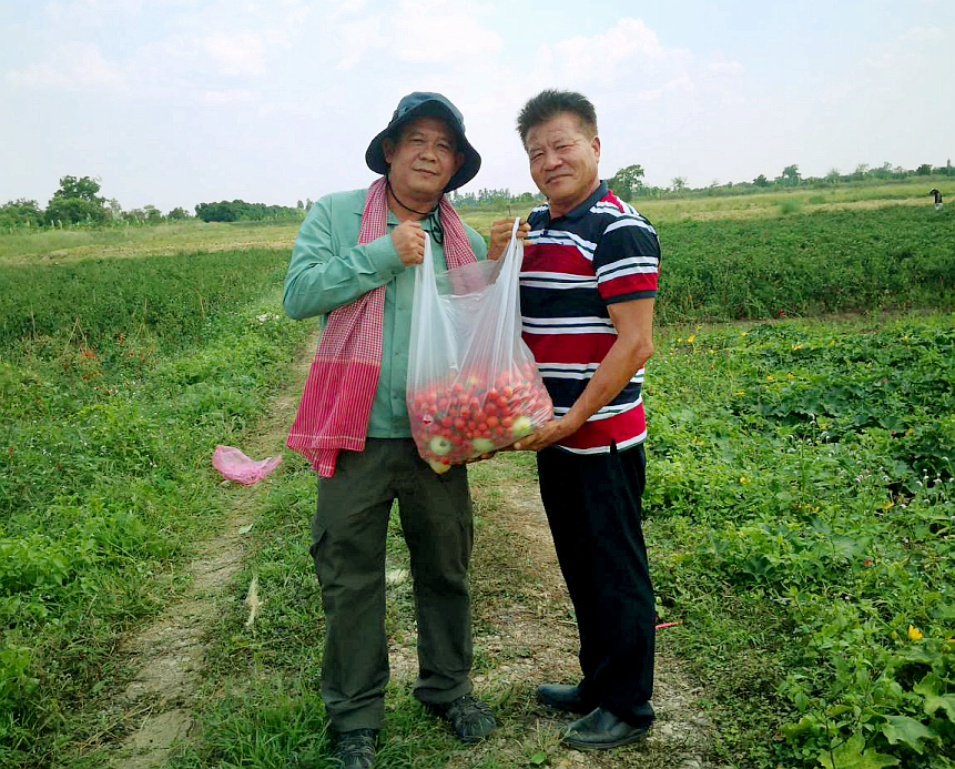 3、蔬菜示范展示的亮点是:当地番茄品种特点是耐高温、抗病性好,但是果型小,产量低;而中国的番茄品种是果型大、产量高,但是在柬埔寨热带气候条件,不耐高温、抗病性差(枯萎病严重)。可喜的是示范园(基地)通过多年的多品种引种到基地种植筛选,把较耐高温、抗病单株种子带回到国内学院基地大棚内在高温、高湿条件下杂交转育,现已获得3个类型(普通生长型、无限生长型、有限生长型)的株系和1个水果型小果类番茄株系在基地种植获得成功。已把今年示范种植的4份株系种子送班迭棉省政府交由农业厅和部队蔬菜种植基地试验种植。