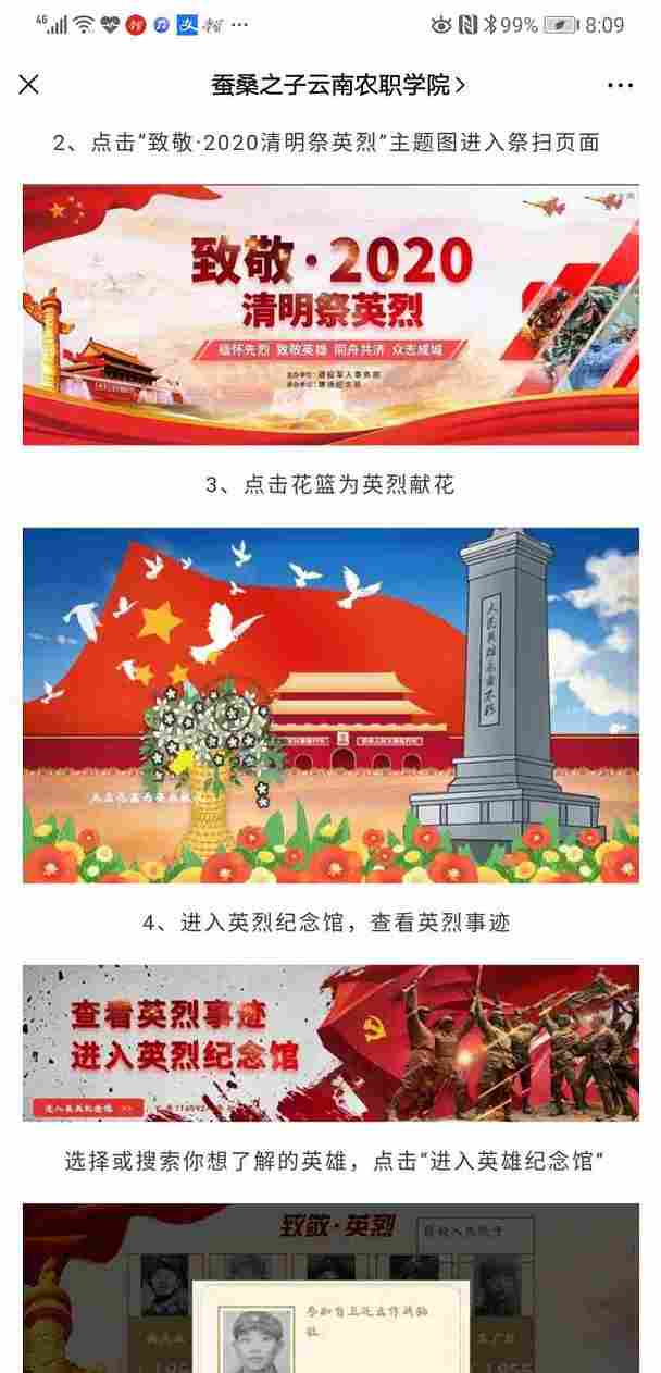师生们通过中华英烈网和学院蚕桑之子公众号开设的“致敬·2020清明祭英烈”专栏,利用电脑、手机进行网上祭奠,向先烈献花、祭拜,了解英烈事迹,寄托对先烈们的哀思,抒写感言寄语,表达对革命先烈的怀念和崇敬之情。