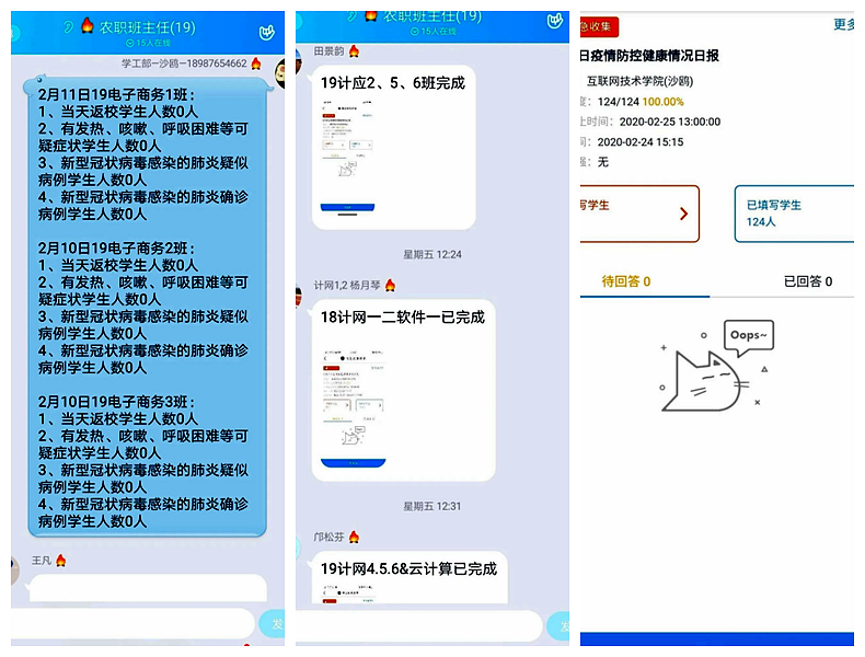 互联网技术学院目前在读学生1167人,疫情爆发之时正值寒假期间,要远程确保所有学生安全无恙不出差错实则是一个艰巨的挑战。第一步行动,学工部班主任老师们第一时间联系到每一名学生,安抚并叮嘱学生保持联系,保证每日通过“今日校园”APP填写健康日报落实到位。