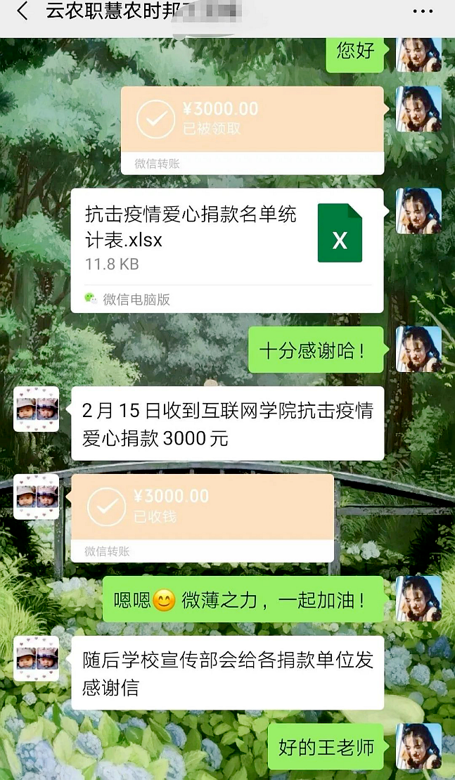 在这举国奋战的时期,所谓“一方有难,八方支援”,互联网技术学院的师生也都纷纷伸出援手,只期望以微薄之力汇聚星火,最终得以燃烧成熊熊烈火。云农职-美和易思校企共建教职员工通过云农职-惠农时邦青年之家平台捐出3000元善款,以爱心善举助力抗疫。