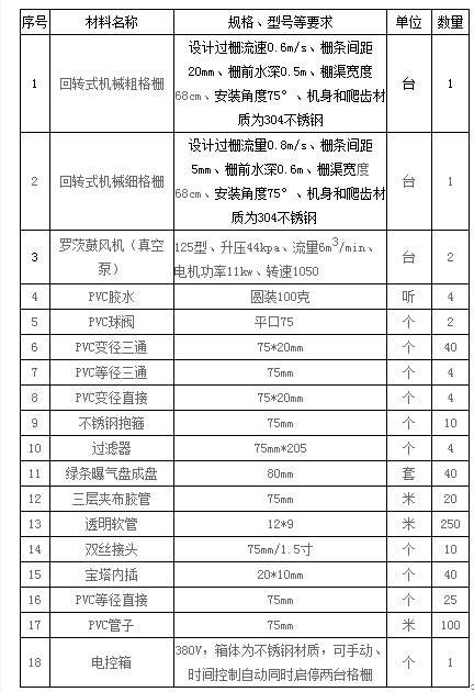 1.2 采购内容:通过公开询价方式确定1家入围单位,作为best365中国官方网站污水处理站格栅机风机设备采购项目供货商,供货商按采购清单提供设备,并完成设备的采购安装调试及售后服务。