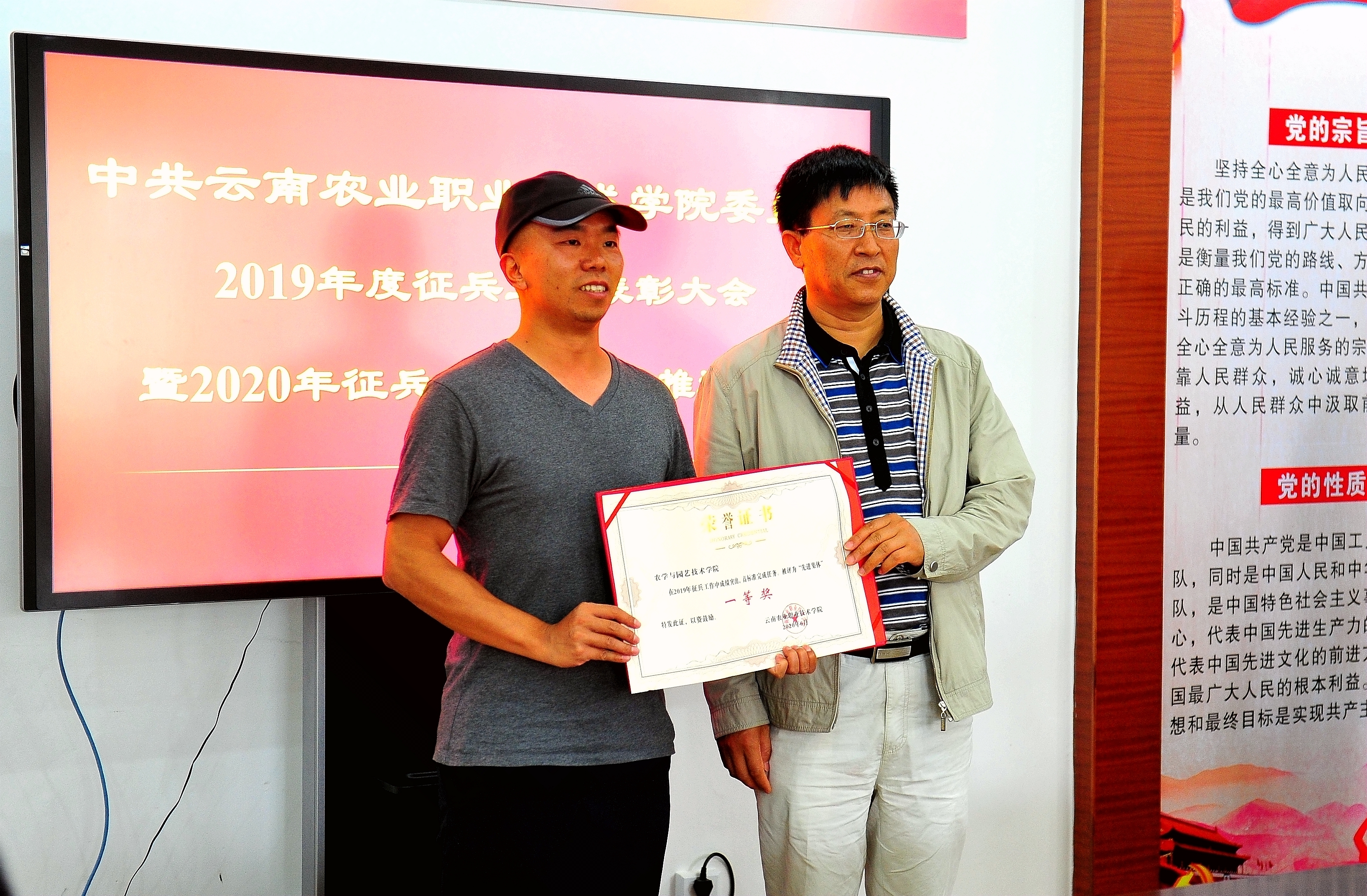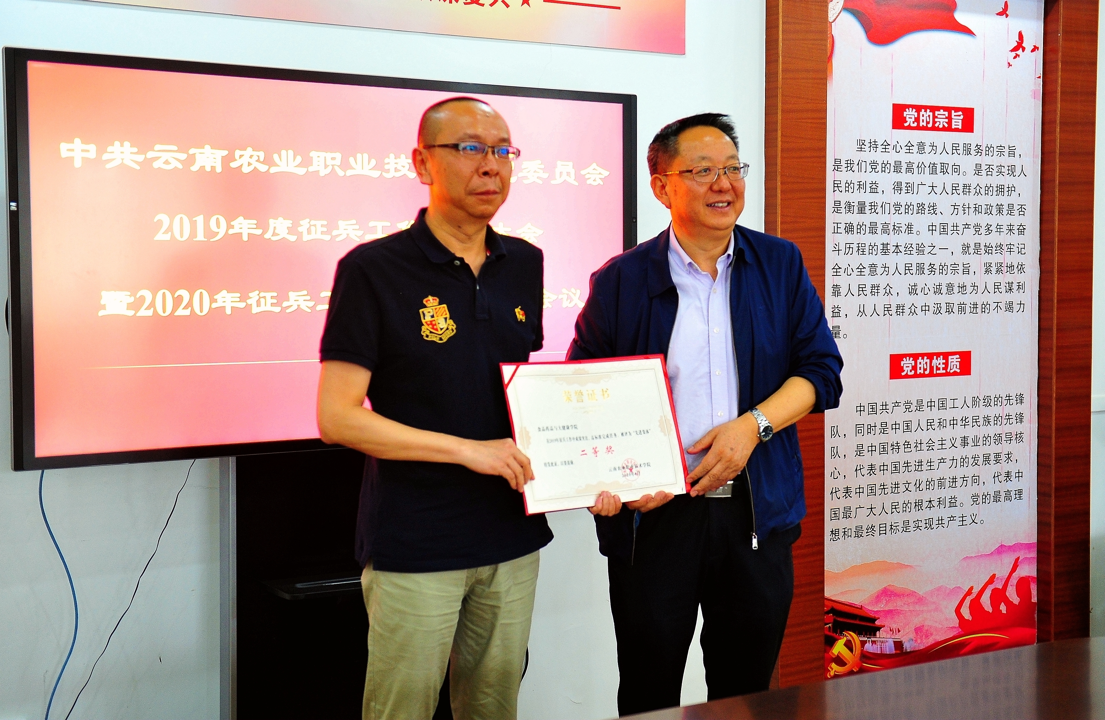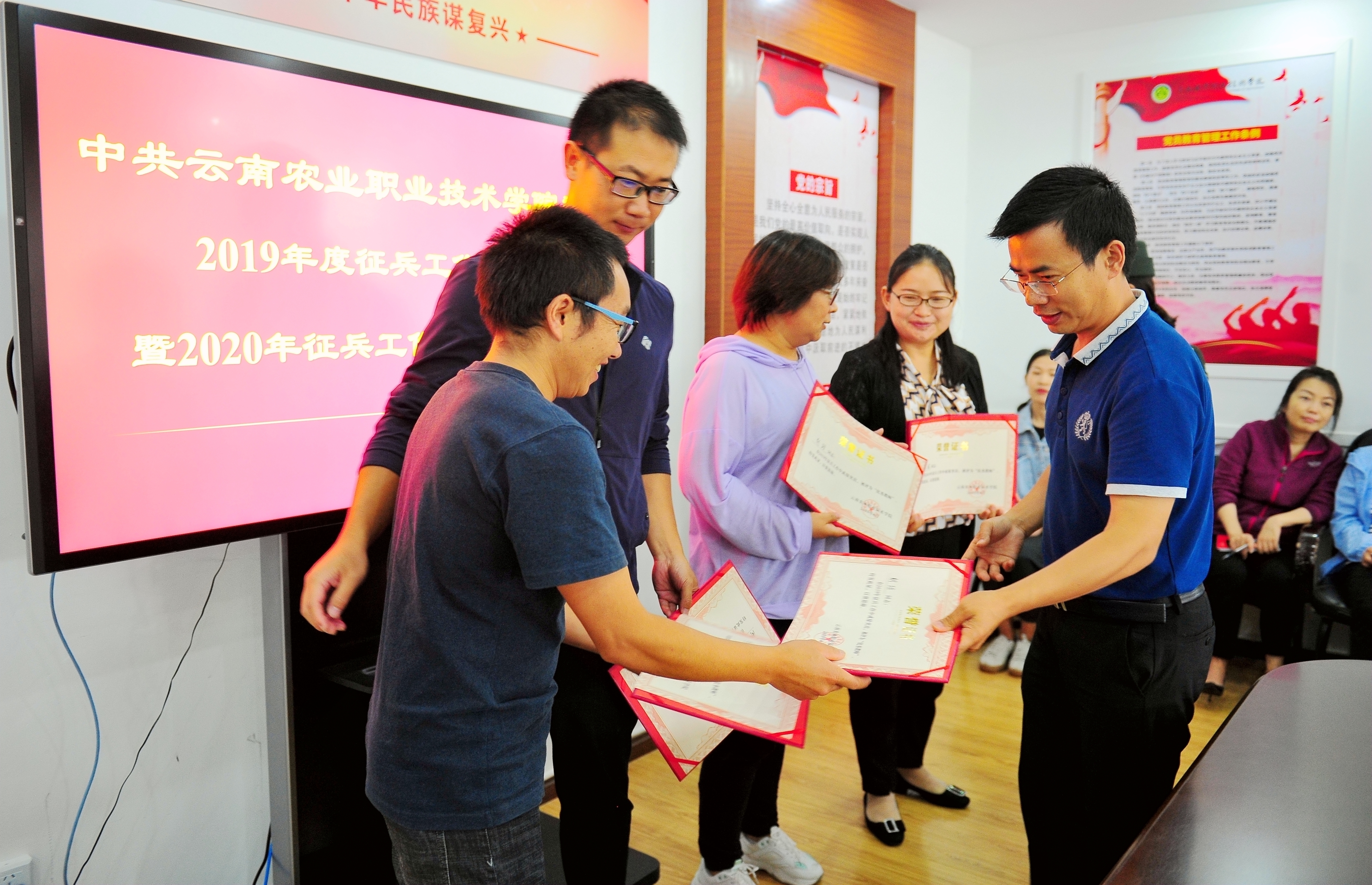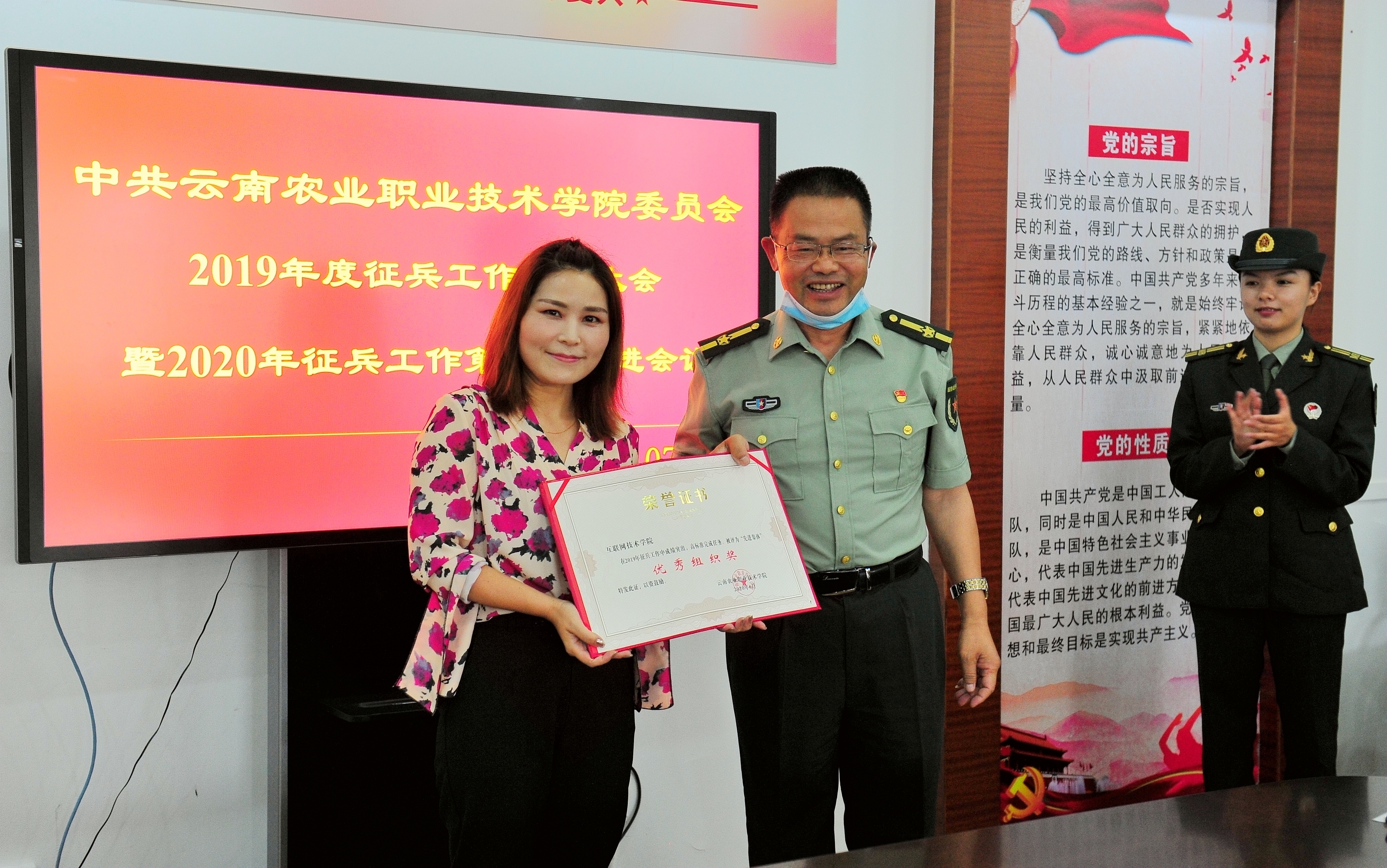 会上,文俊院长宣读了荣获2019年度征兵工作“先进集体”和“优秀个人”的表彰决定,农学与园艺技术学院、食品药品大健康学院和工程学院分别荣获一、二、三等奖,互联网技术学院荣获优秀组织奖,学院党委书记崔金赋、院长文俊、党委副书记伍学龙、人民武装部部长凌军分别为获奖集体和个人颁发荣誉证书并合影留念;未完成2019年征兵任务的二级学院主要负责人向党委作情况说明;学院人民武装部部长凌军作2019年度征兵工作总结,汇报了2020年征兵工作情况,2020年各二级学院上报征兵报名共计652人,其中245人的应征地为学院,并明确下一阶段征兵工作目标任务。