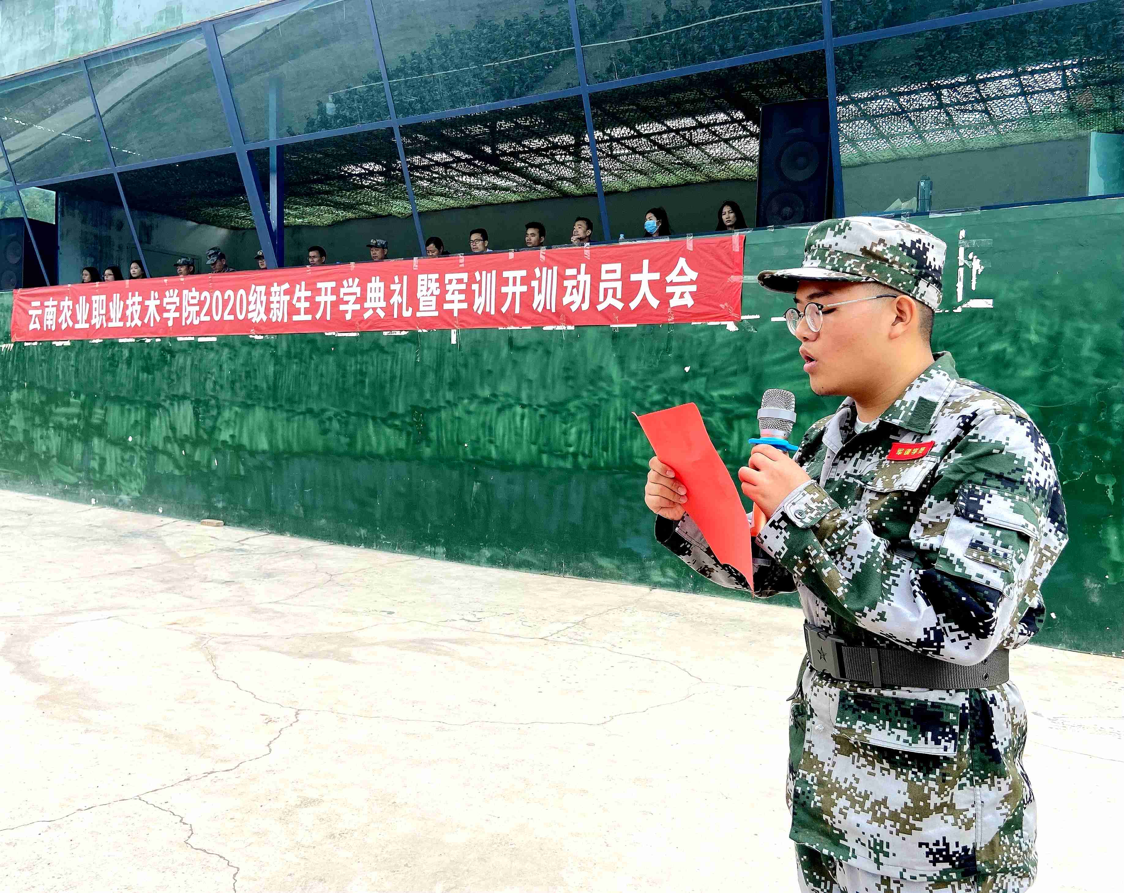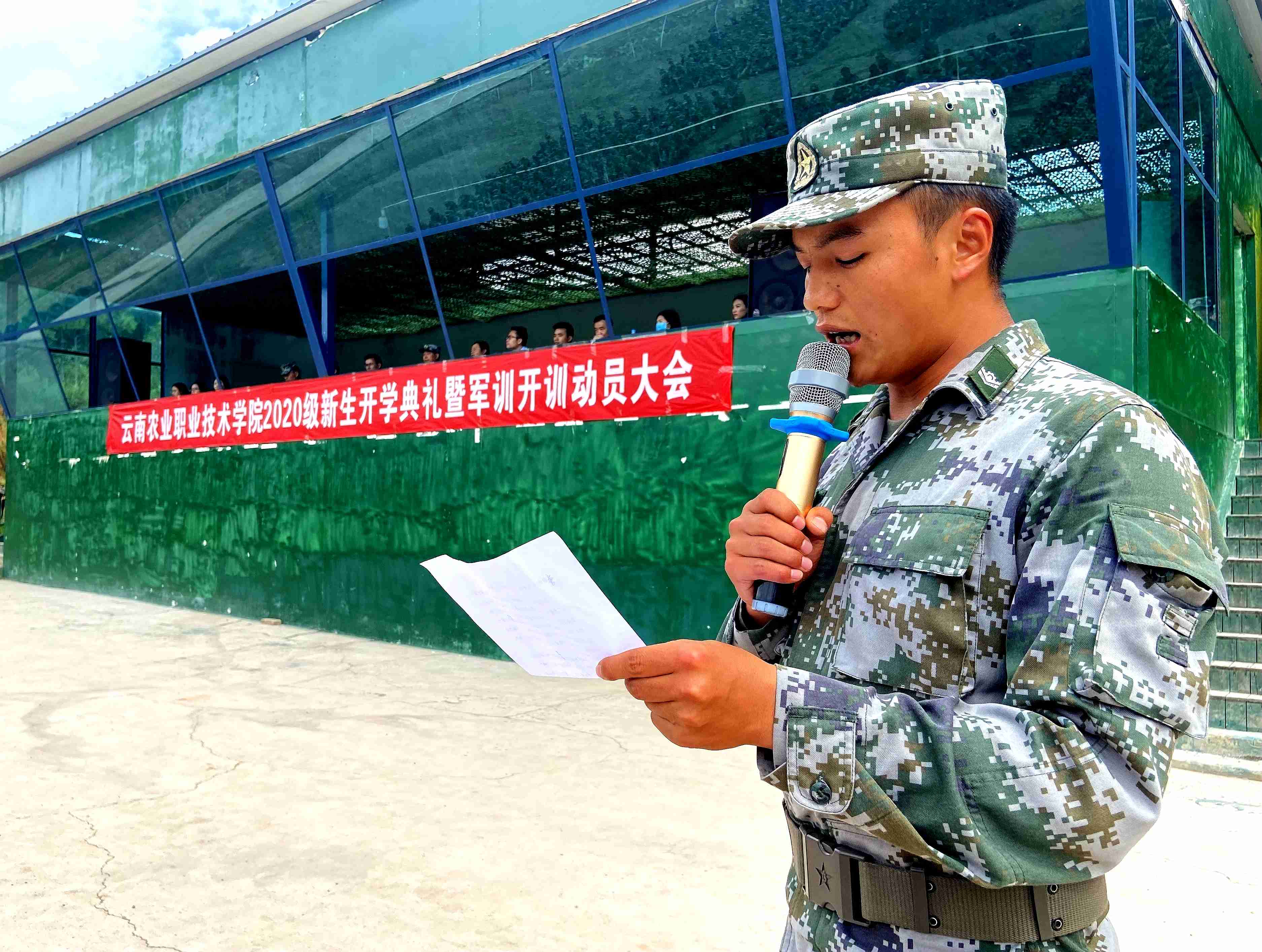贾云保教官代表新生军训教官发言,他希望同学们在今后的军训生活中振奋精神、认真参训、听从指挥、严守纪律。2020级新生班主任李娇老师作为教师代表发言,希望同学们在军训中磨炼意志,锻炼体魄,培养受益一生的良好生活作风。2020级计算机应用技术4班张净生同学代表新生发言,表示在今后的14天里,一会遵循教官的指挥和安排,严格遵守,不辱使命,直到军训圆满完成!