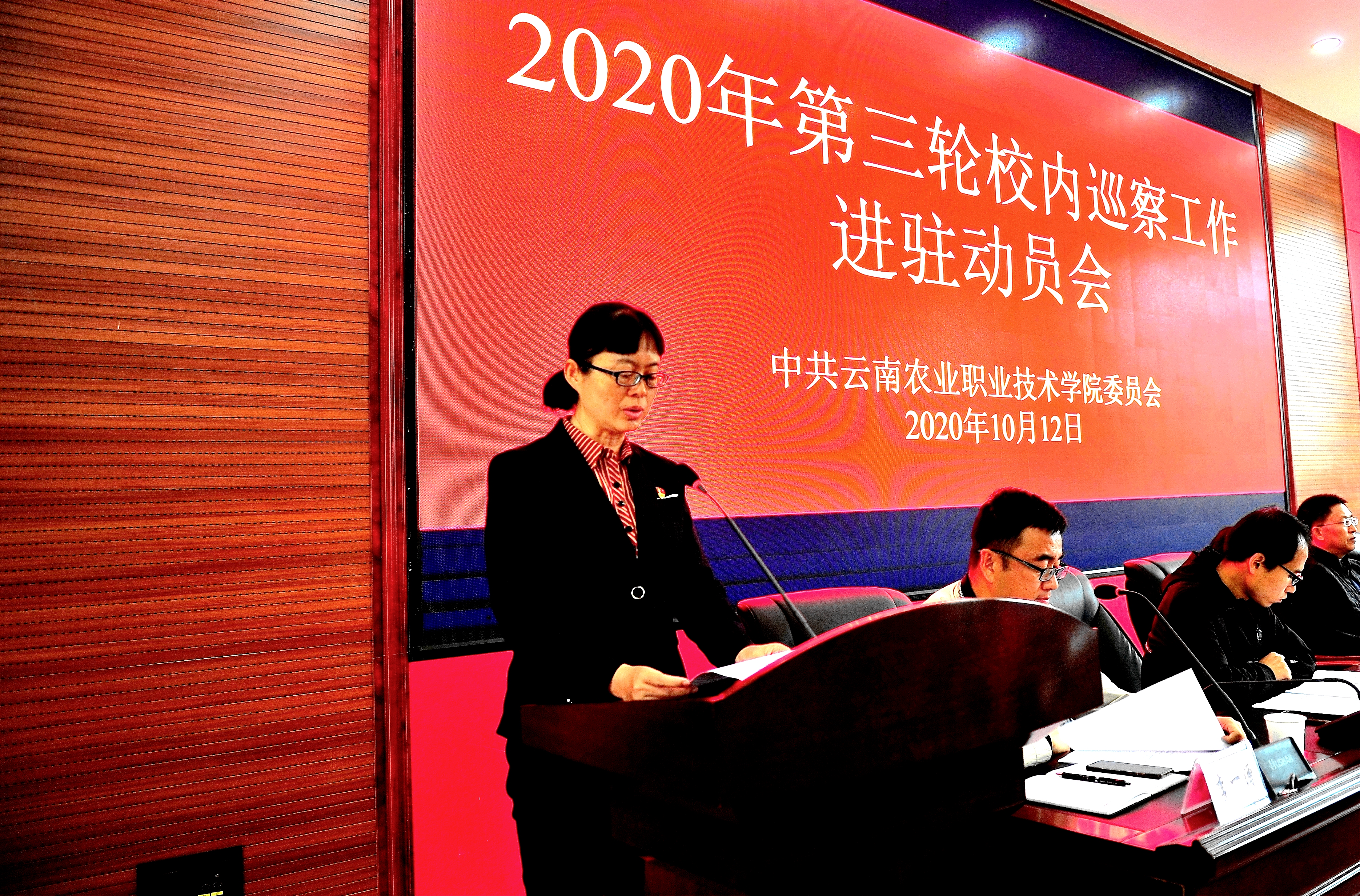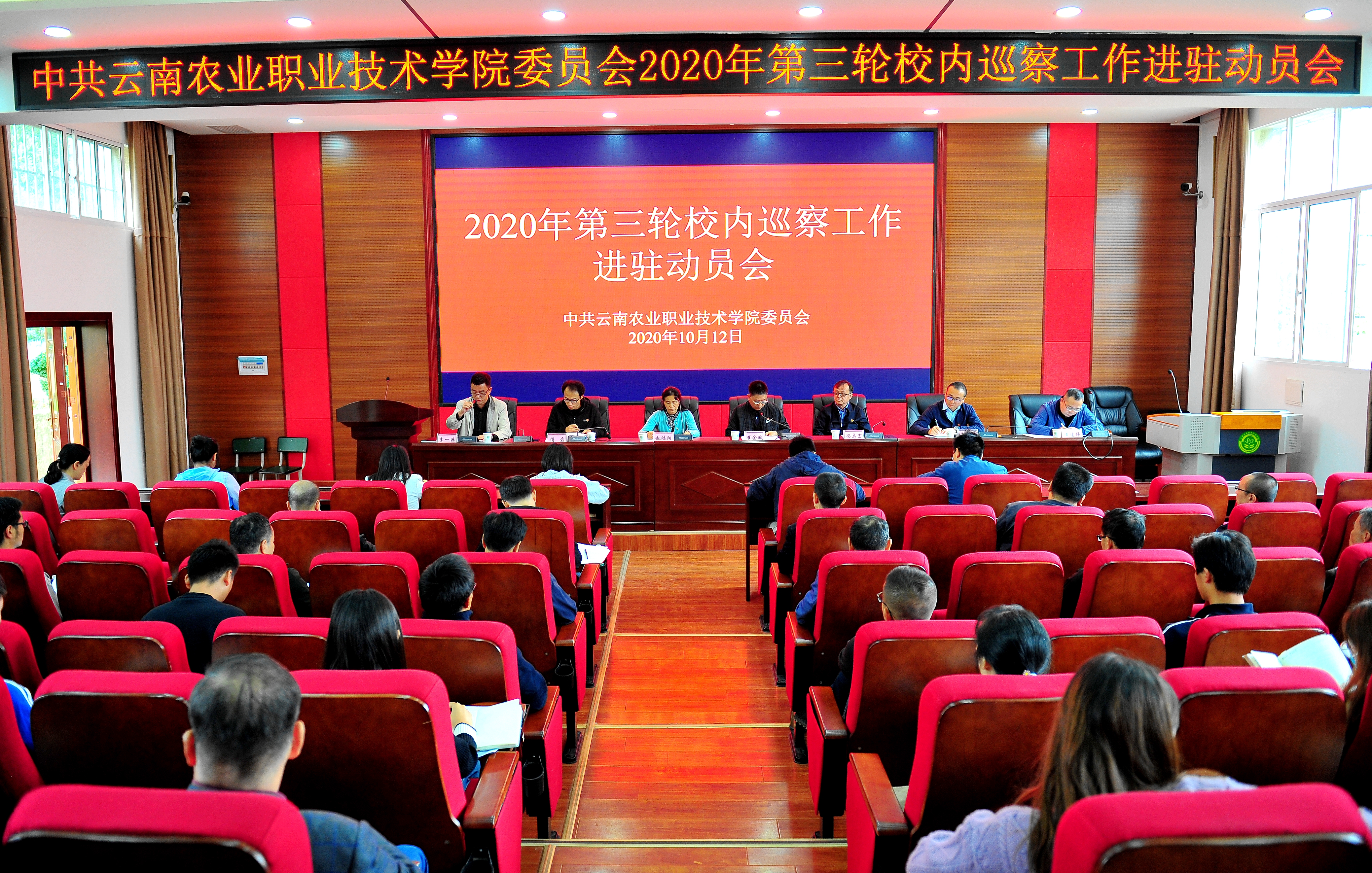 通知中心2020年10月12日上午,根据党委安排部署,第三轮校内巡察工作巡察组进驻被巡察部门,召开了巡察工作动员会,将开展为期30天的巡察工作。巡察工作领导小组有关成员、党委巡察办负责人、巡察组全体成员,被巡察部门全体干部职工,被巡察部门近三年以来原任主要负责人,延伸巡察部门相关负责人,教师代表、学生代表参加了会议。