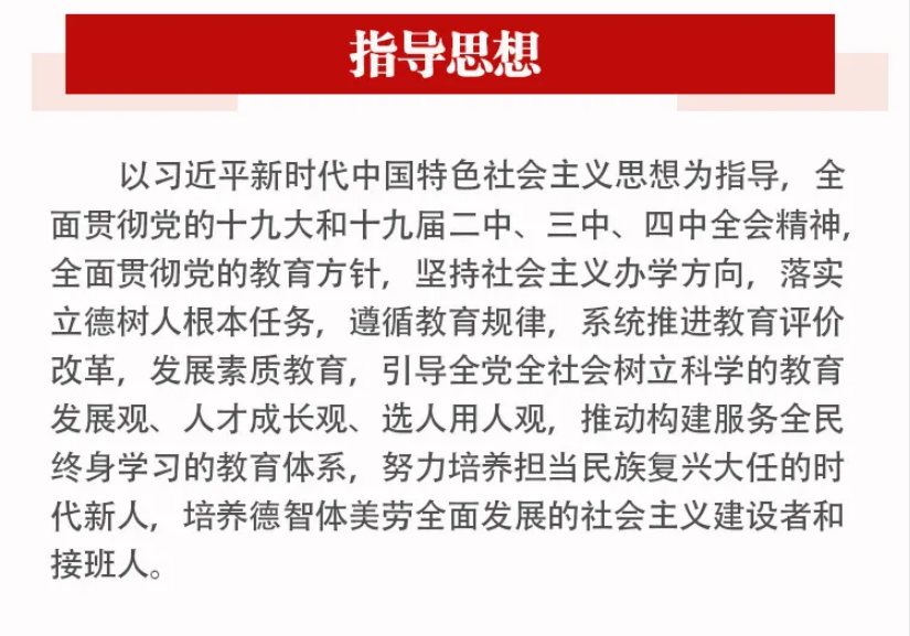 (一)指导思想。以习近平新时代中国特色社会主义思想为指导,全面贯彻党的十九大和十九届二中、三中、四中全会精神,全面贯彻党的教育方针,坚持社会主义办学方向,落实立德树人根本任务,遵循教育规律,系统推进教育评价改革,发展素质教育,引导全党全社会树立科学的教育发展观、人才成长观、选人用人观,推动构建服务全民终身学习的教育体系,努力培养担当民族复兴大任的时代新人,培养德智体美劳全面发展的社会主义建设者和接班人。